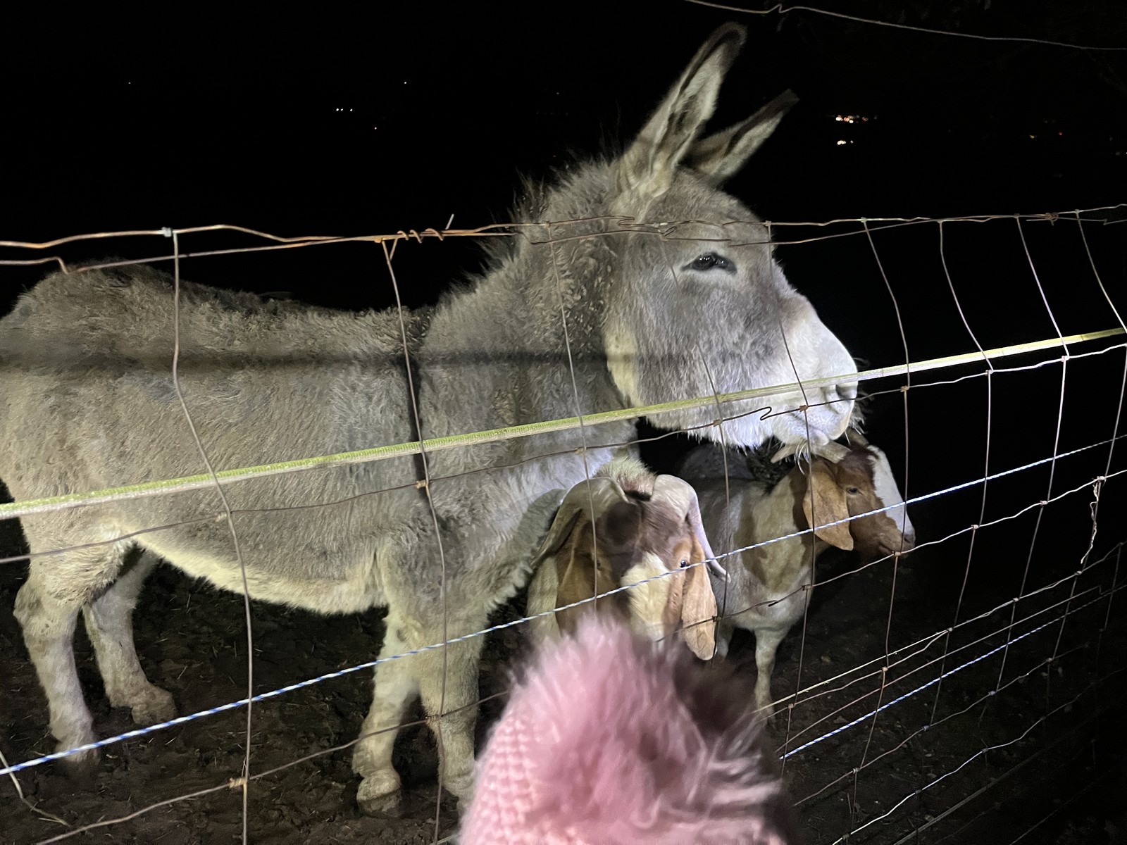 Pot nazaj v Krško ni bila mogoča brez svetilk. Prestrašili smo prijaznega osla in koze.