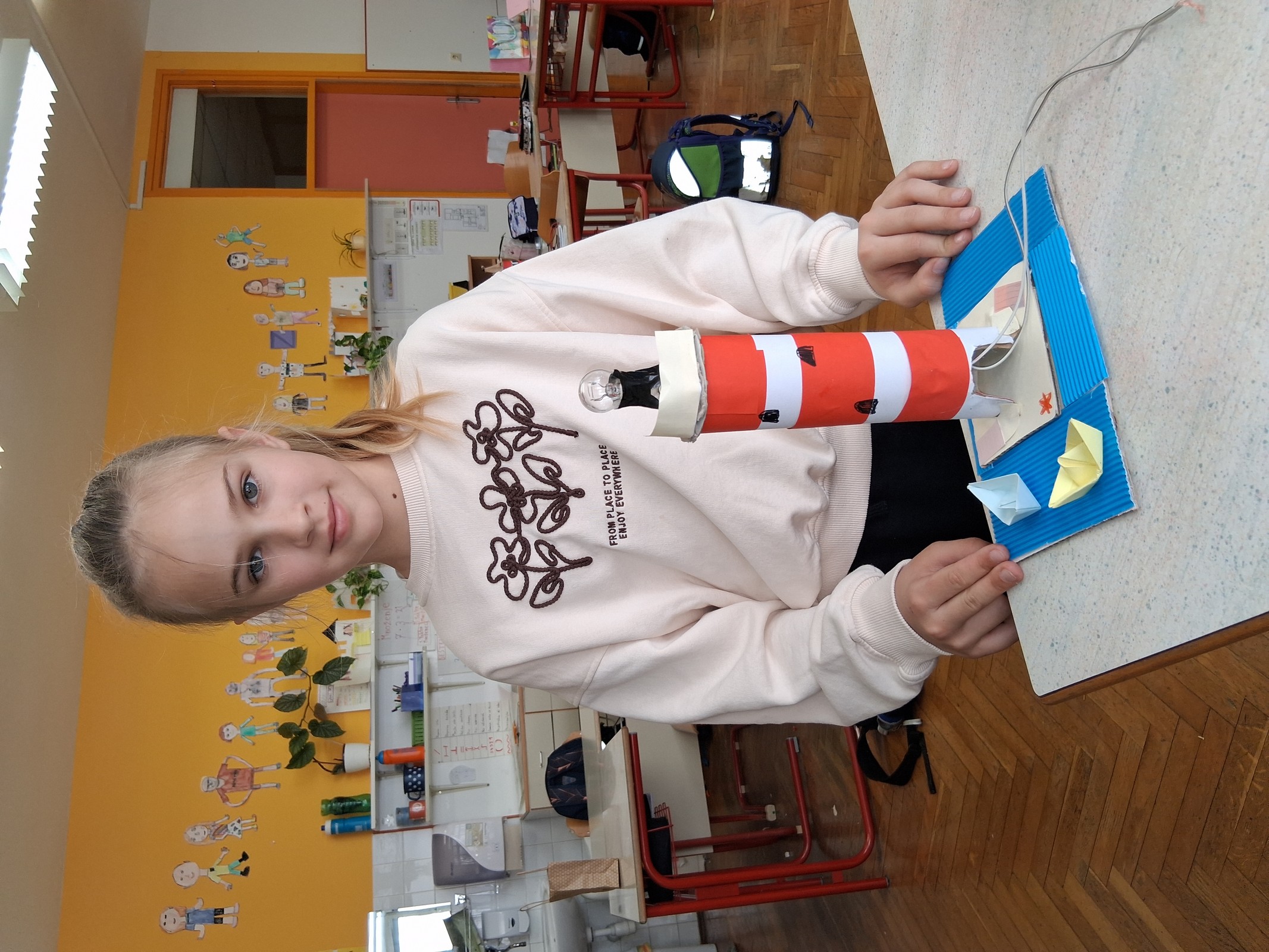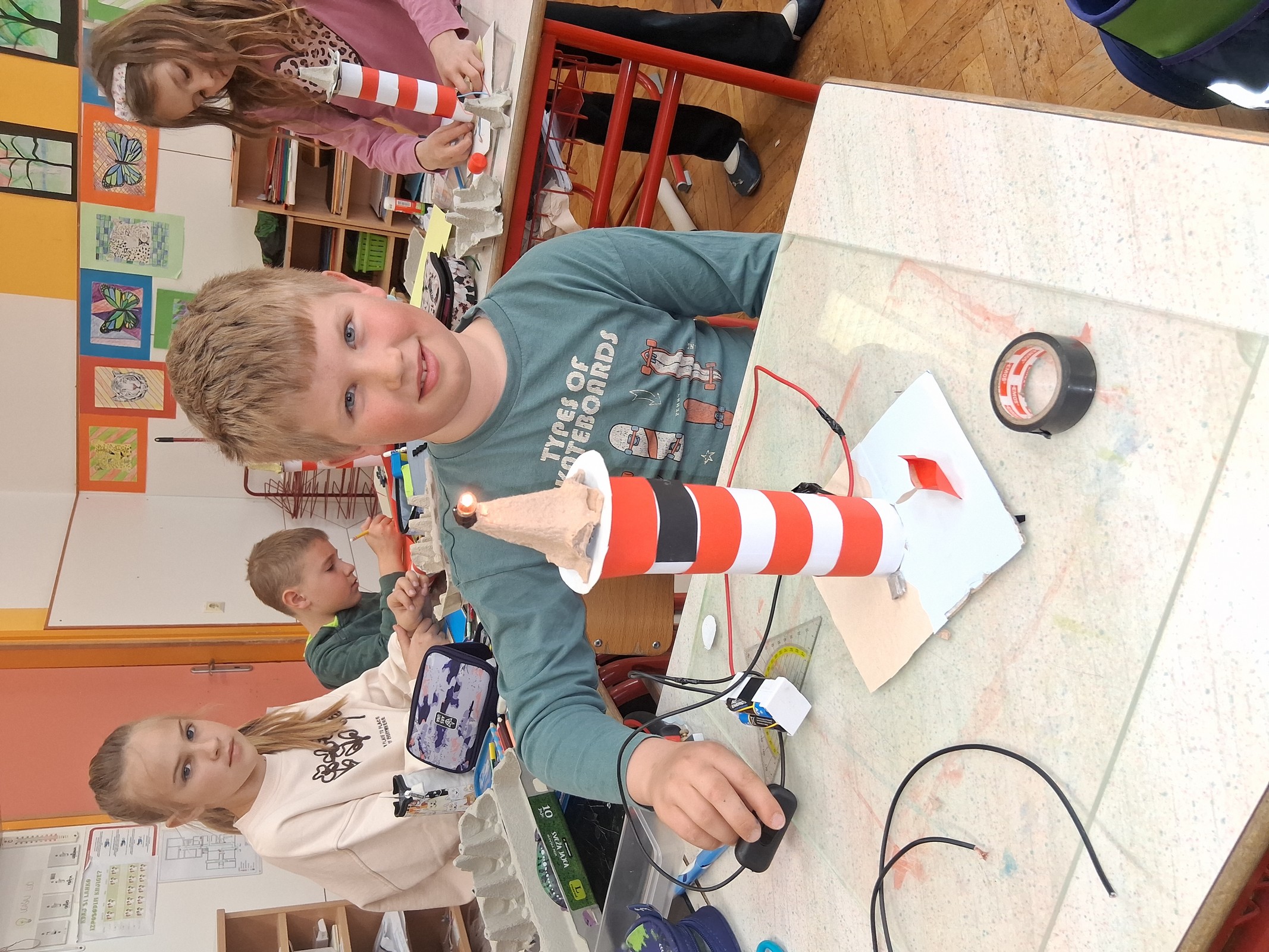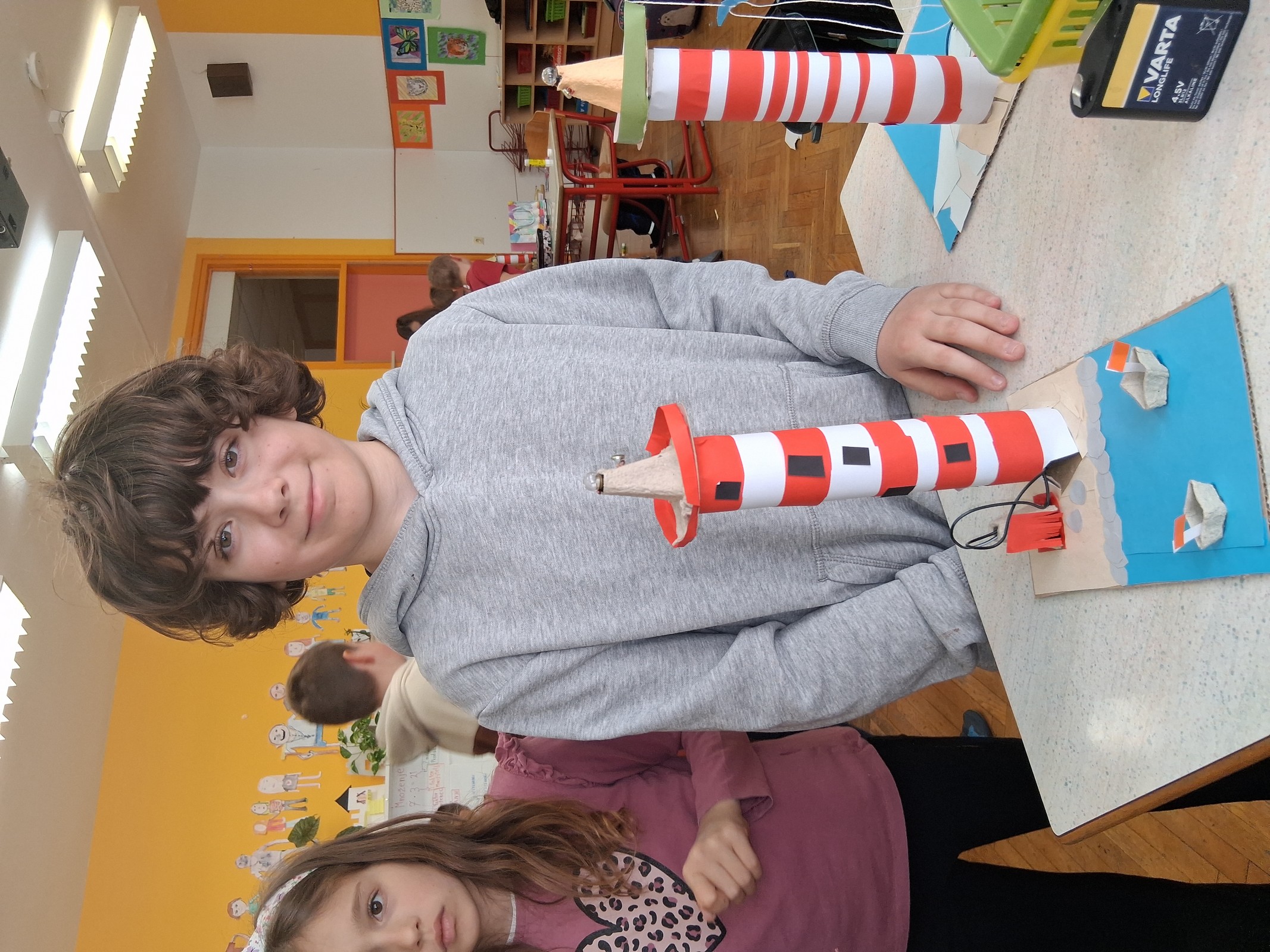 Napeljali so tudi žice in žarnico povezali z baterijo, da je svetilnik zasvetil.