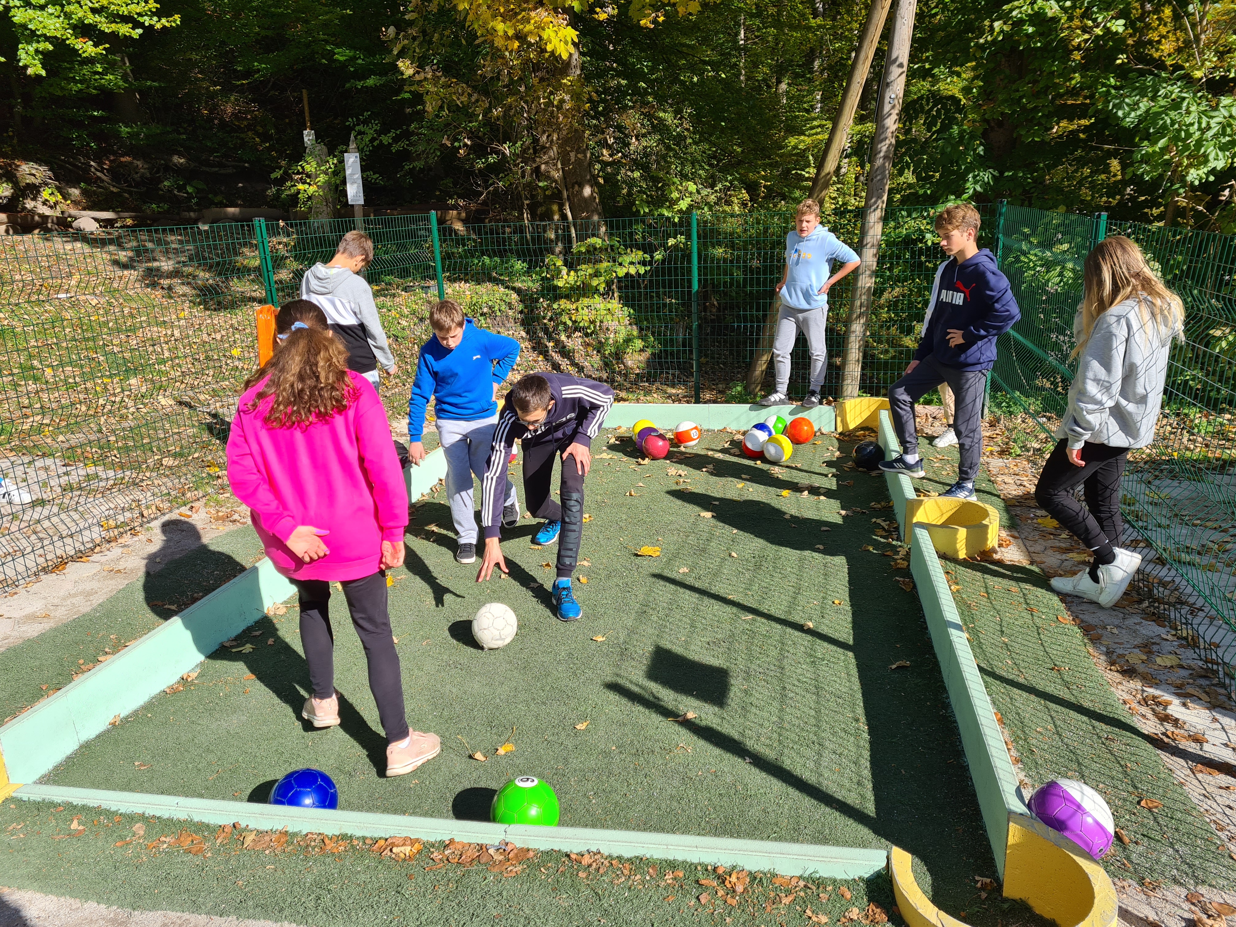 Danes smo začeli dan z igranjem nogometnega biljarda in plezanjem po motorični poti.