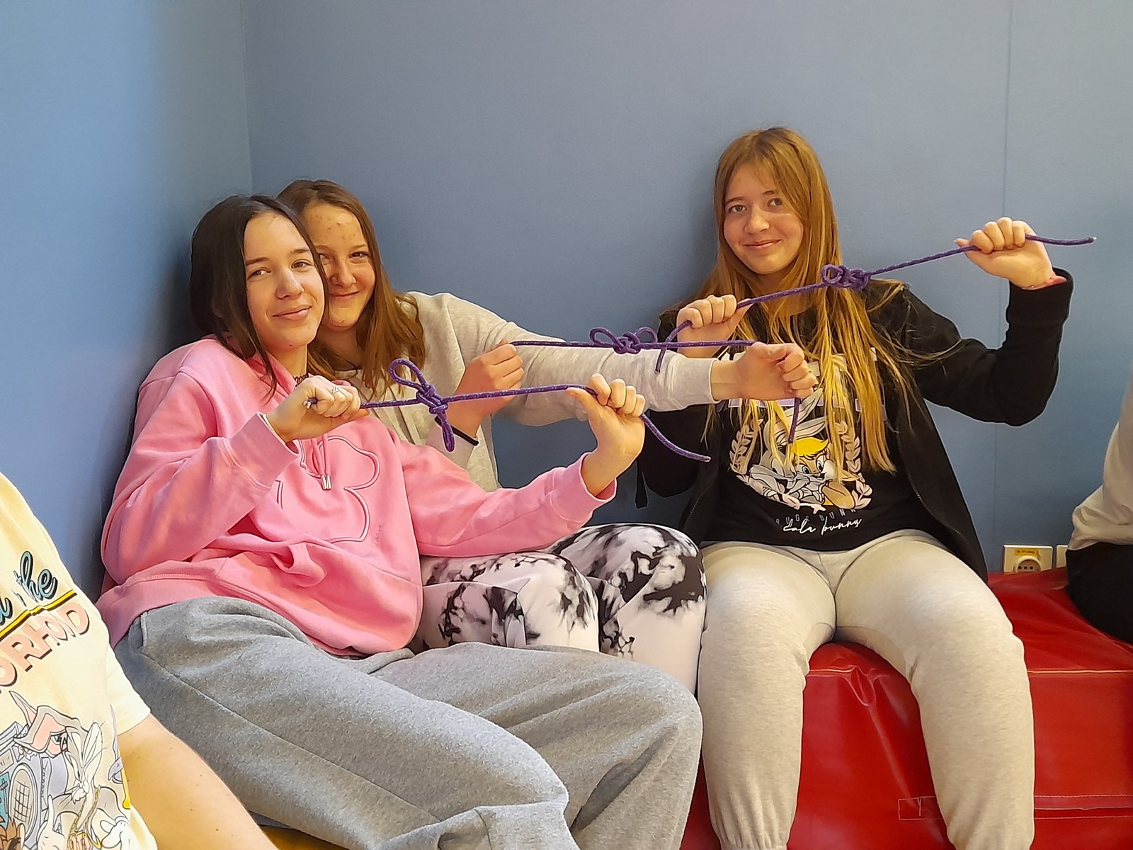Razdeljeni v dve skupini smo se izmenjavali pri učenju vezanja vozlov in vožnji kanujev po smaragdni gladini mirnega jezera.