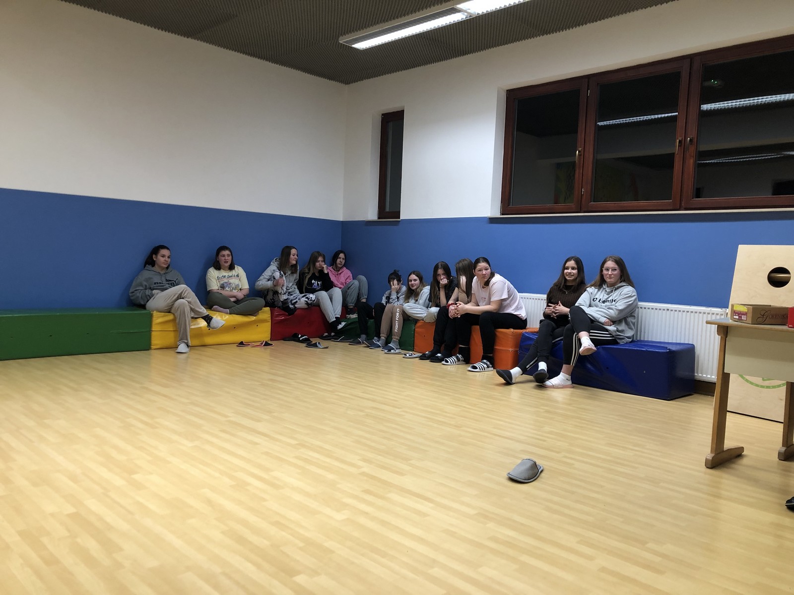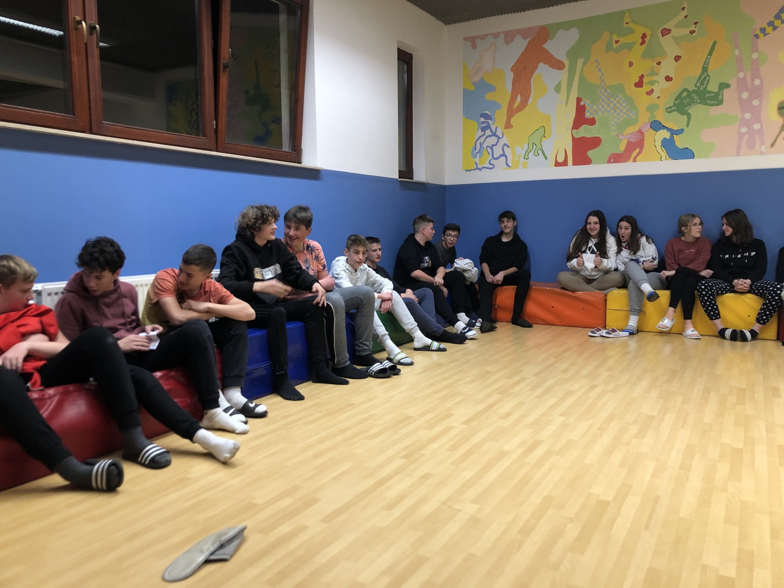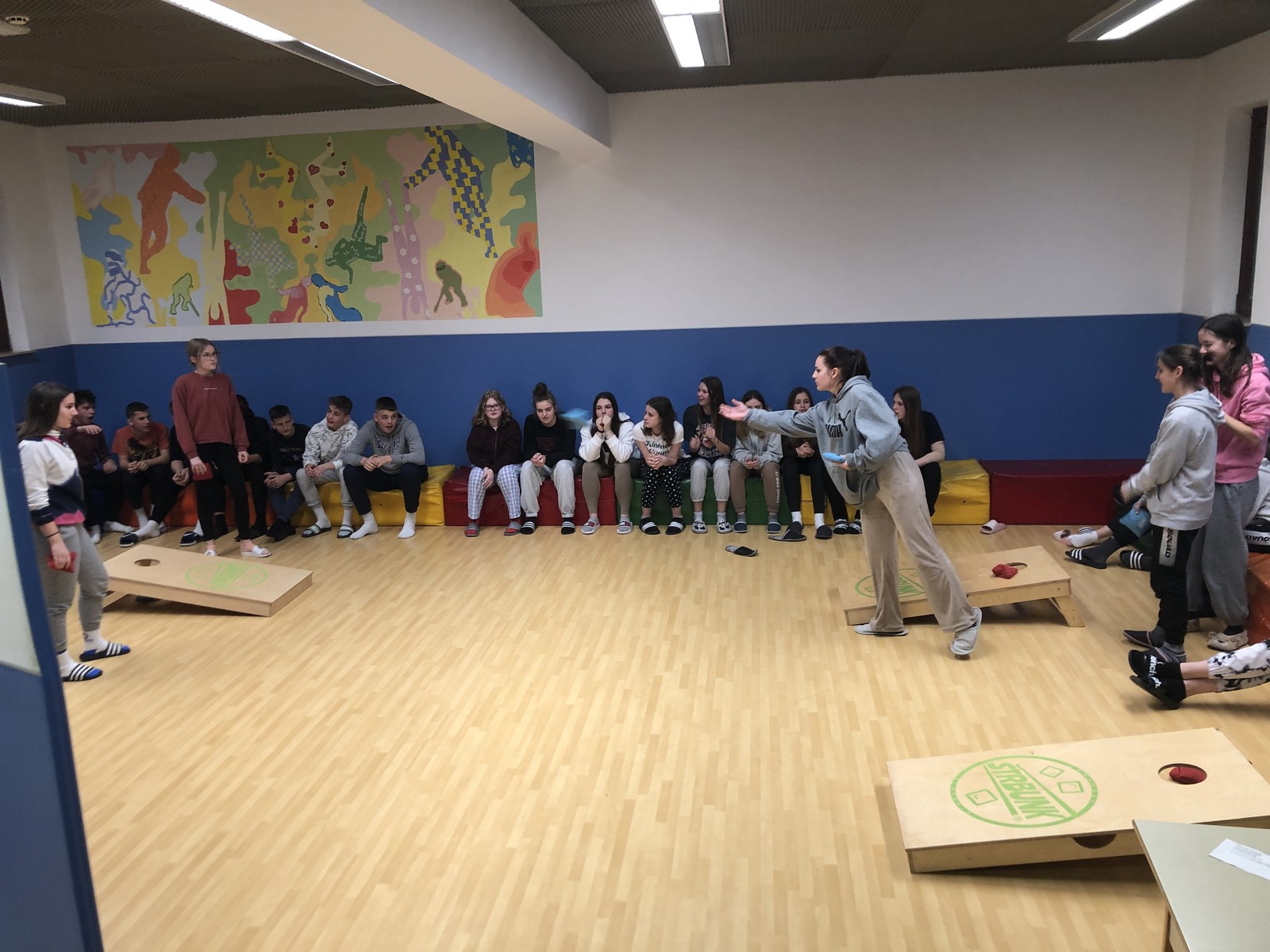 Dan, ki smo ga večinoma preživeli v naravi, smo zaključili z zabavnim turnirjem štrbunka, izbiranjem trojic za petkovo tekmovanje in gledanjem nogometne tekme.