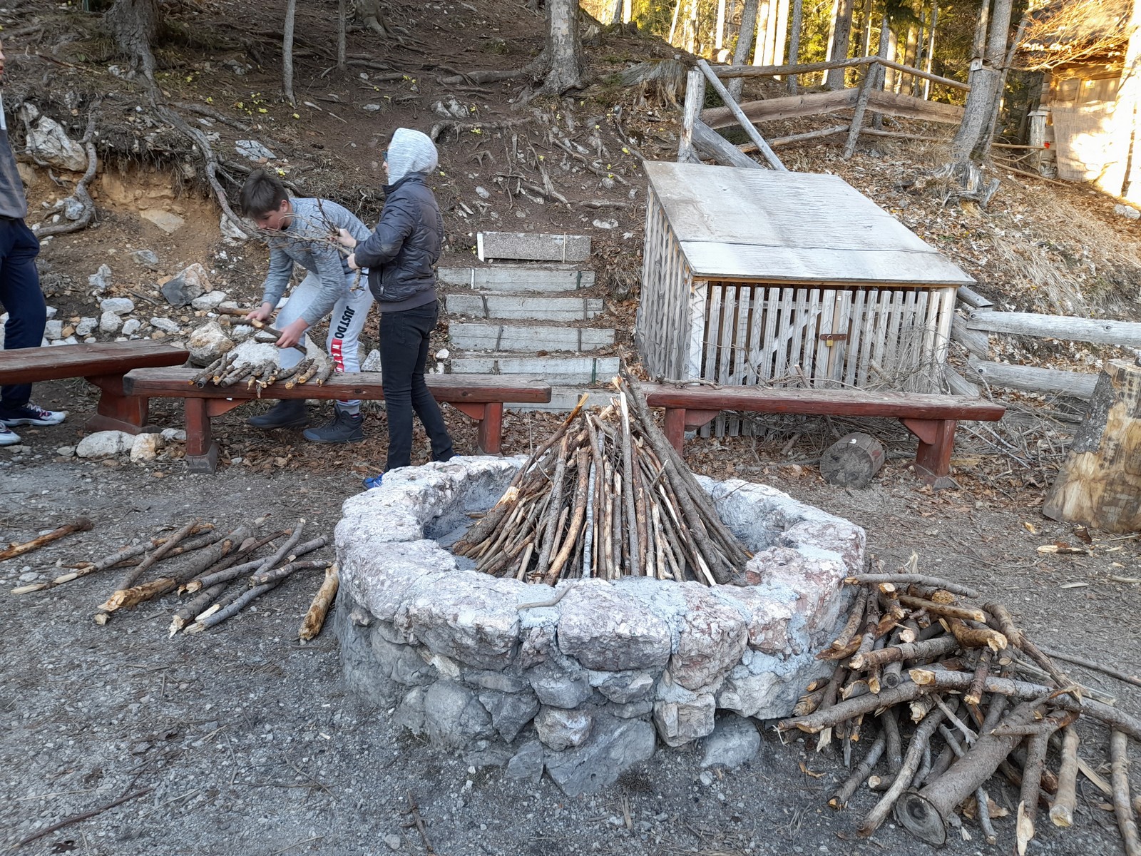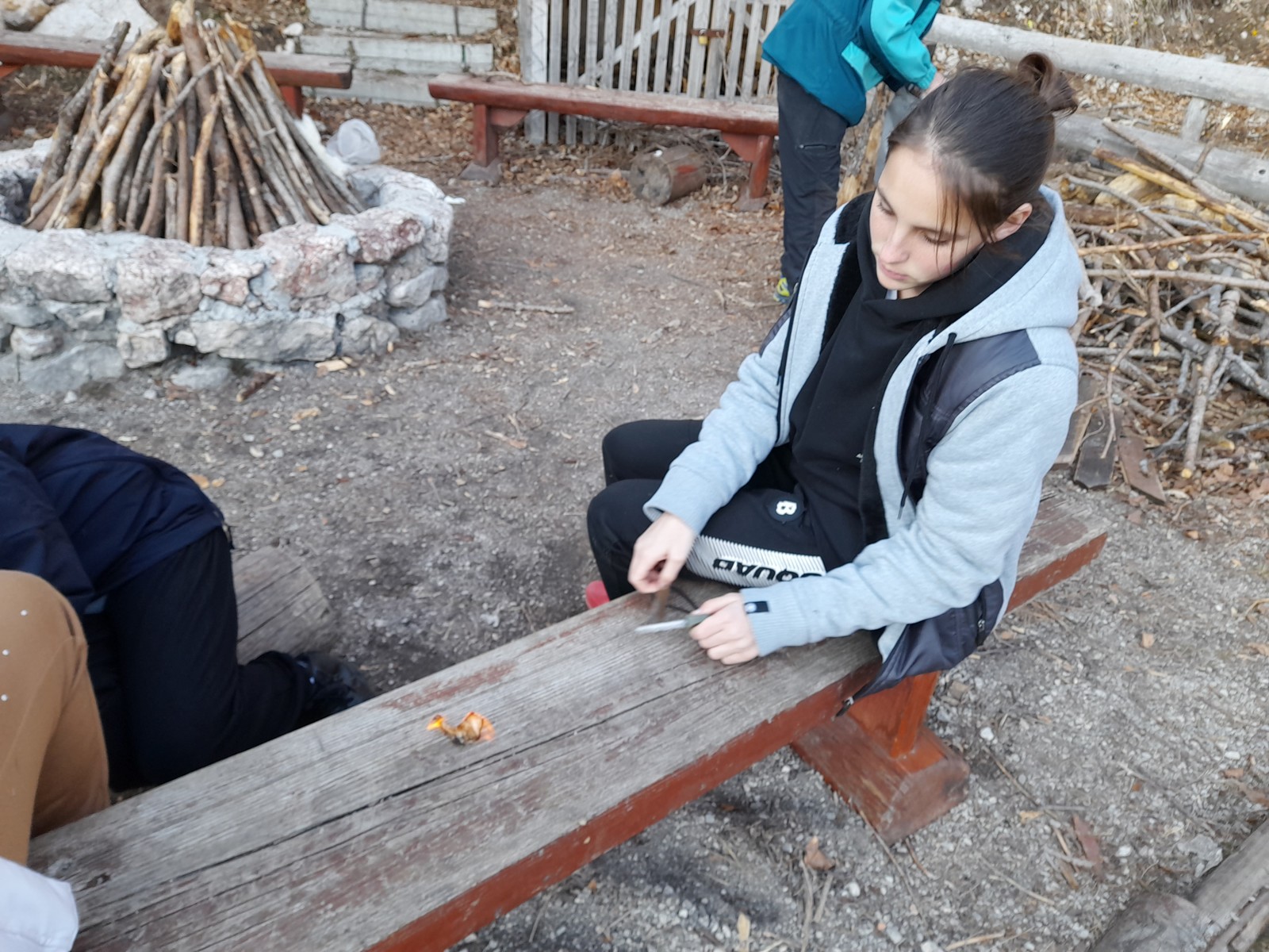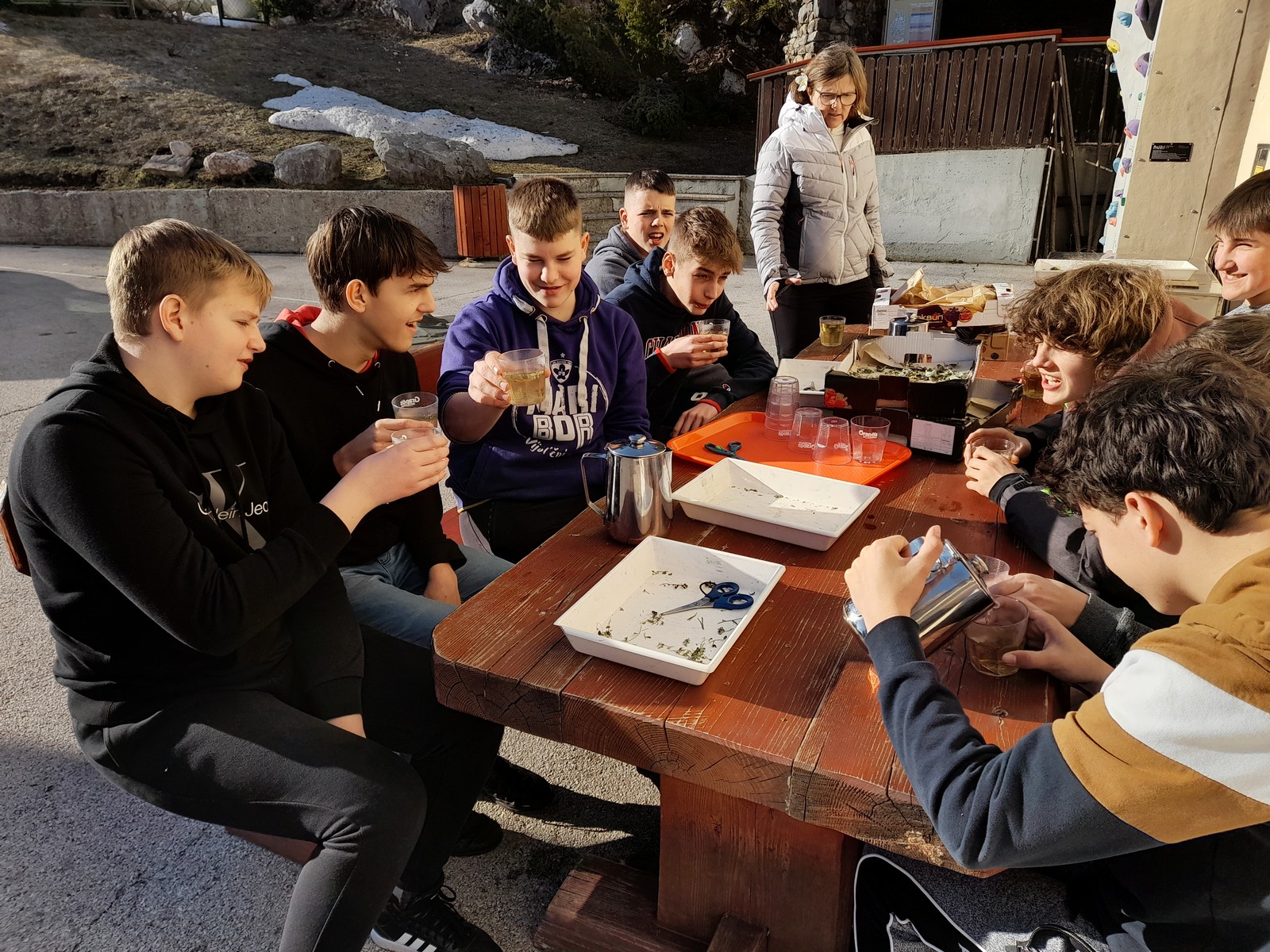 Ob treh so sledile popoldanske aktivnosti. Razdelili smo se v tri skupine. Ena skupina je kuharju pomagala pripraviti večerjo. Druga skupina je nabirala zelišča in pripravila čaj. Tretja skupina je pripravljala kres in se naučila zanetiti ogenj.