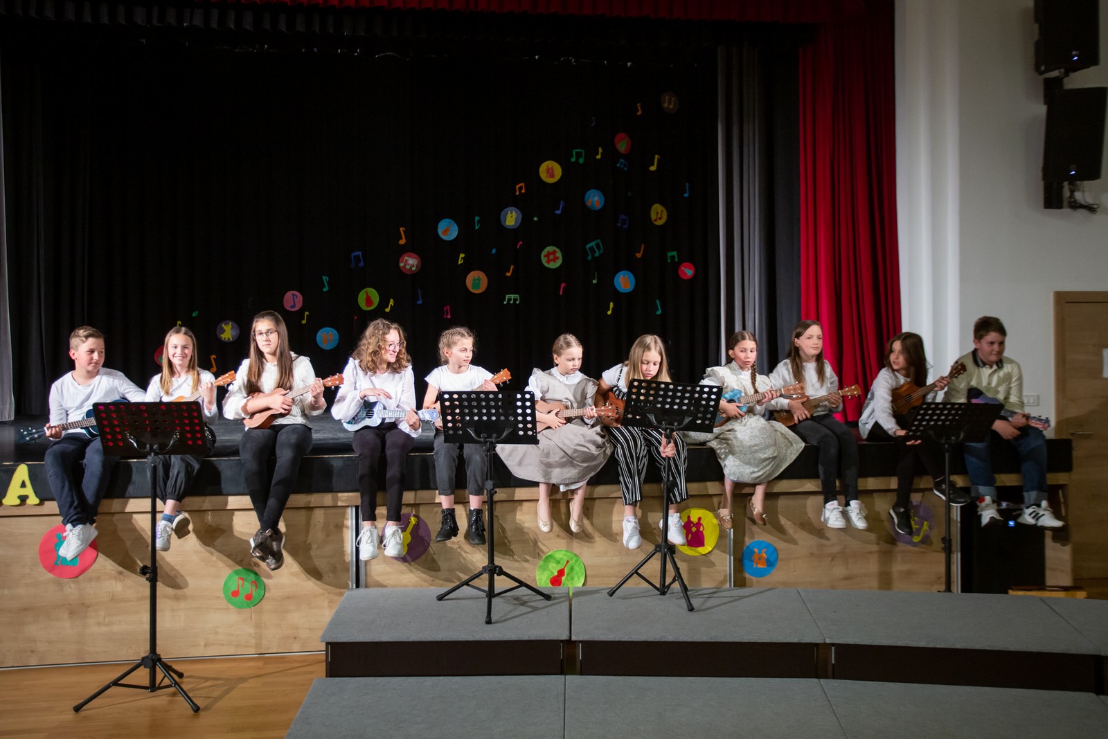 Posebej prisrčna je bila tudi skupina petošolcev z dvema drugošolkama, ki se je predstavila z igranjem na ukulele, česar so se sami priučili, malce pa jim je z nasveti pomagala mentorica Ela Verstovšek Tanšek.
