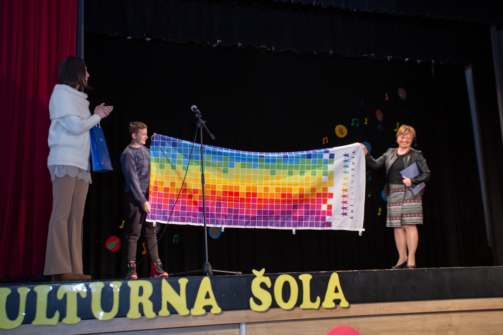 Drugi razlog – morda še pomembnejši – pa je bil, da smo že v preteklem letu znova prejeli naziv kulturna šola za obdobje 2021—2025, ki ga šolam podeljuje Javni sklad Republike Slovenije. Na objavljen razpis se lahko prijavijo šole, ki izkazujejo nadpovprečno aktivno kulturno udejstvovanje učencev in njihovih staršev, starih staršev ter mentorjev v sklopu obšolskih dejavnosti, ki niso del šolskega kurikula. Ker se na naši šoli s kulturnim udejstvovanjem na več različnih področjih vsekakor lahko pohvalimo, smo se na razpis tudi prijavili. In ker je komisija na skladu ugotovila, da smo res edinstveni, nam je podelila naziv kulturna šola. Dokaz, da je temu res tako, je zastava, ki bo vihrala na drogu pred šolo, svečano pa nam jo je na prireditvi podelila Simona Rožman Strnad, vodja brežiške območne izpostave sklada, ki je tudi pohvalila naše delo in izrazila upanje, da se tudi v bodoče tej tradiciji ne bomo odrekli.