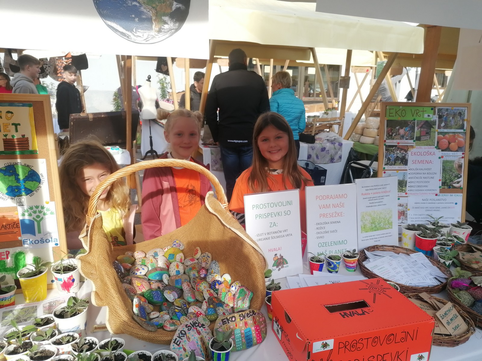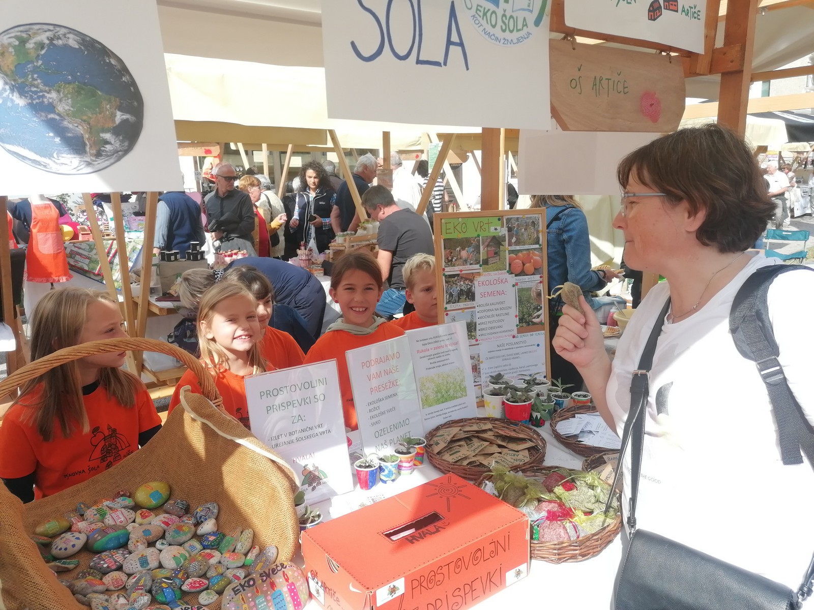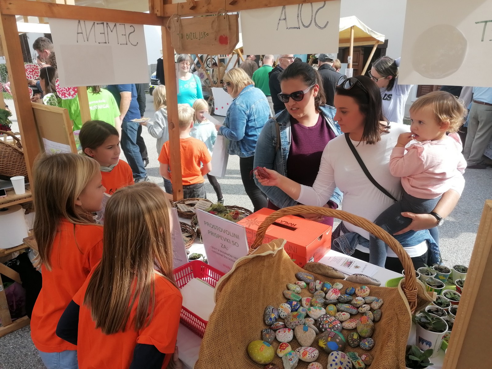 Med ljudi smo delili svoje presežke: semena rukole, ognjiča in žametnice, dišeče vrečke sivke, eko svečke na kamnih, mini kalanhoje.