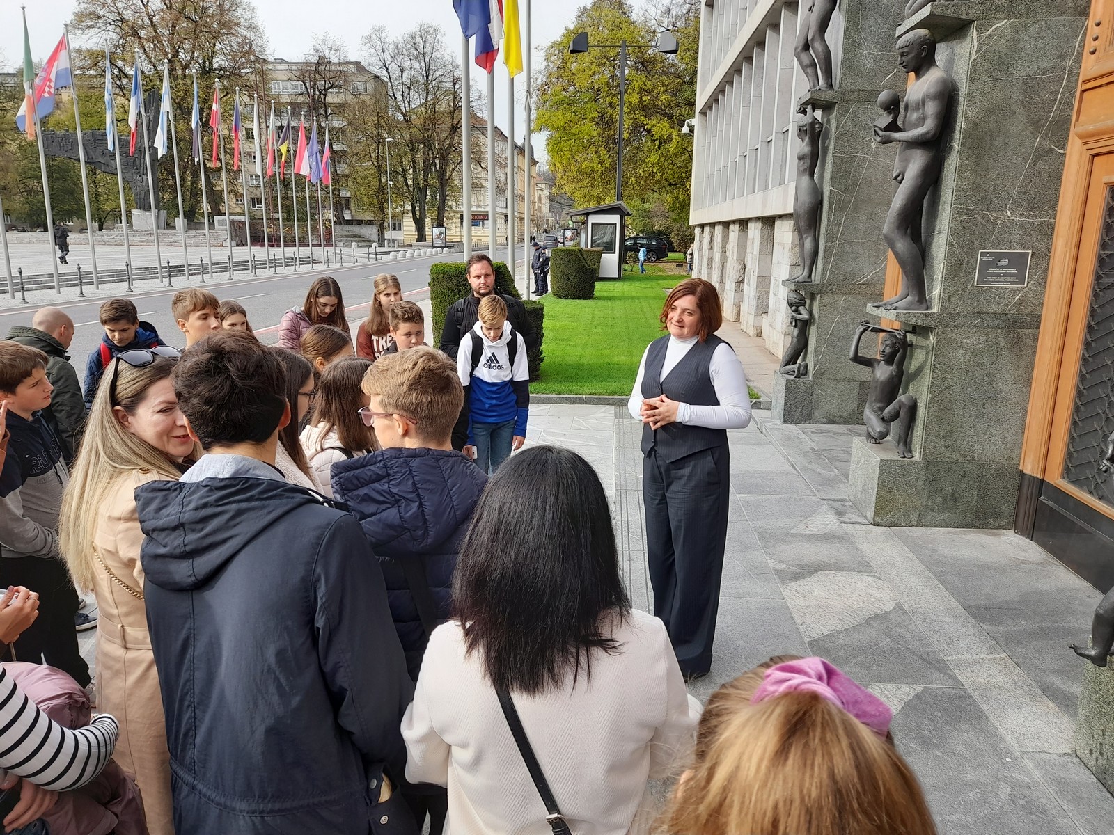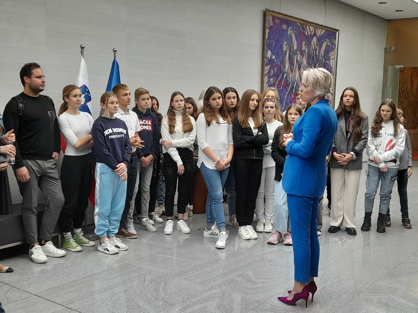 Notranjost našega parlamenta nas je najprej navdušila z lepoto hodnikov, stopnišč, mozaikov in stenskih slik s slovensko zgodovino, nato pa še s prijaznim pozdravom naše predsednice državnega zbora Urške Klakočar Zupančič.