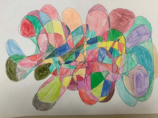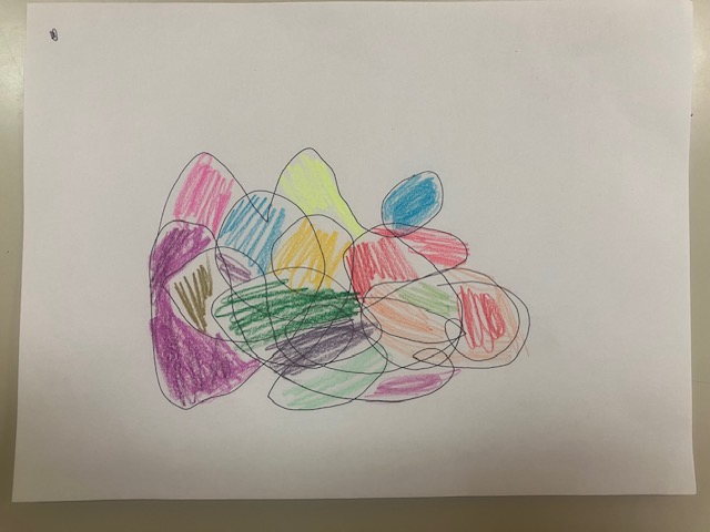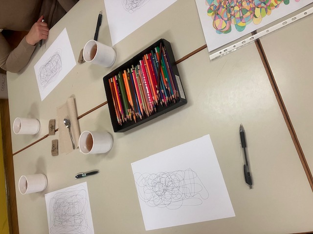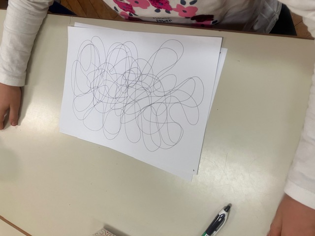 Najprej smo miže vlekli sklenjeno črto po belem papirju 1 minuto, nato pa miže izbirali barvice in z njimi zapolnjevali nastale prostorčke.
