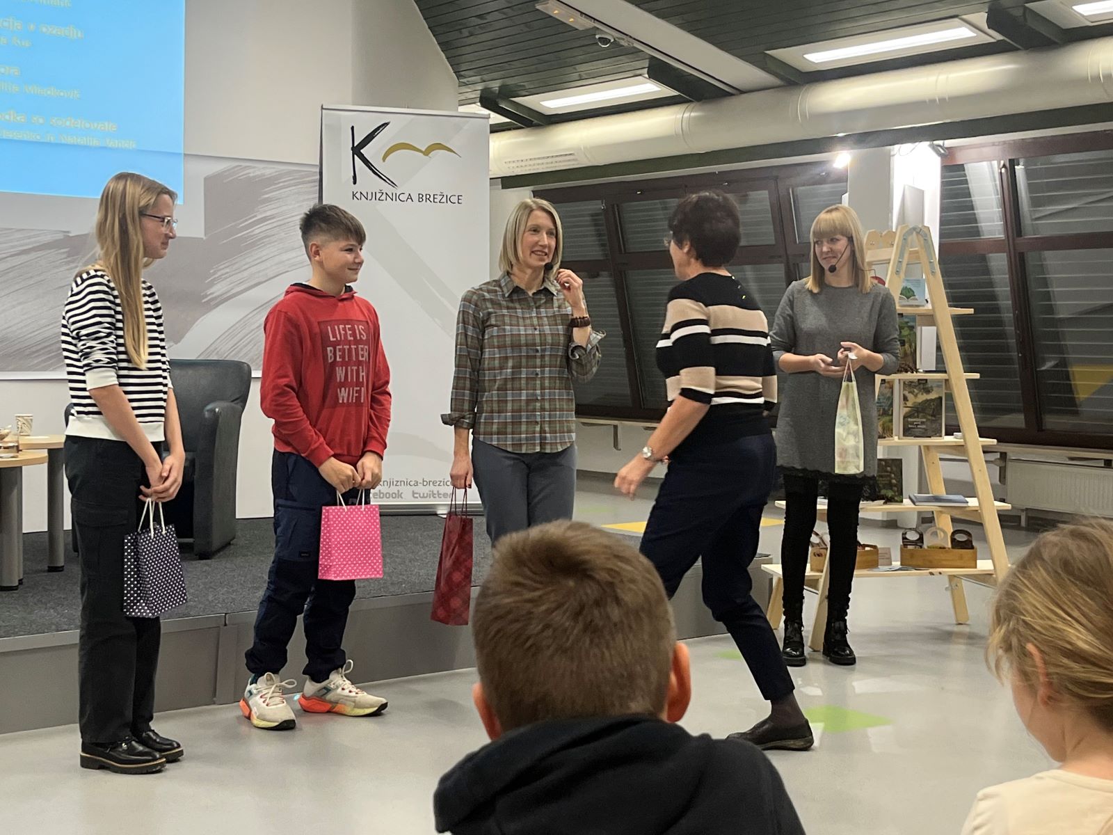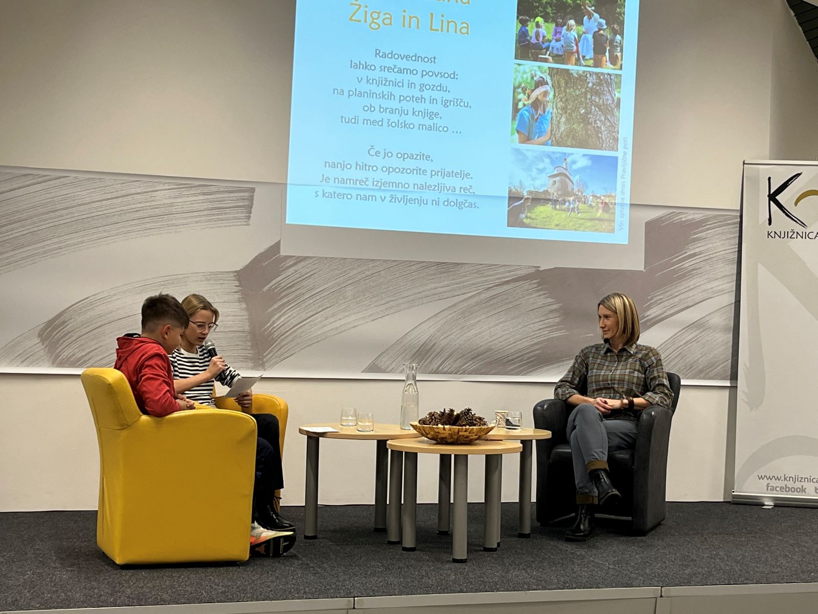 Žiga Ostrelič in Lina Pintarič sta pisateljici, planinski vodnici in pravljičarki Ireni Cerar zastavljala zanimiva vprašanja, mladi planinci pa smo jih prišli poslušat. Tokrat smo se iz Artič do knjižnice Brežice podali kar peš. Skupaj s psičko Belo nas je bilo kar 23.