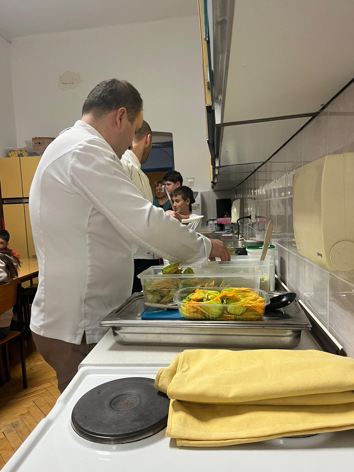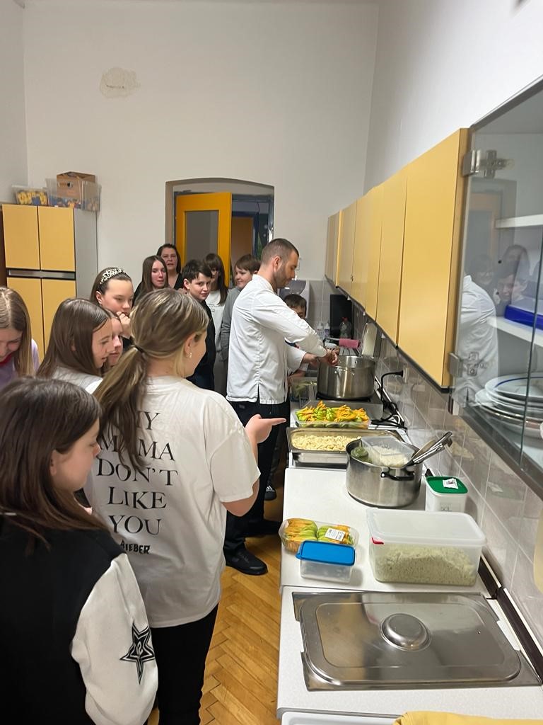 Nato smo se skupaj z učenci podali v kuhinjo, kjer smo imeli priložnost sodelovati pri pripravi njegovih slavnih testenin. Chef Jure nas je navdušil s svojimi kuharskimi veščinami ter nam pokazal nekaj trikov in tehnik, kako iz ekoloških sestavin pripraviti vrhunske in okusne jedi. Učenci so z veseljem sodelovali pri pripravi jedi.