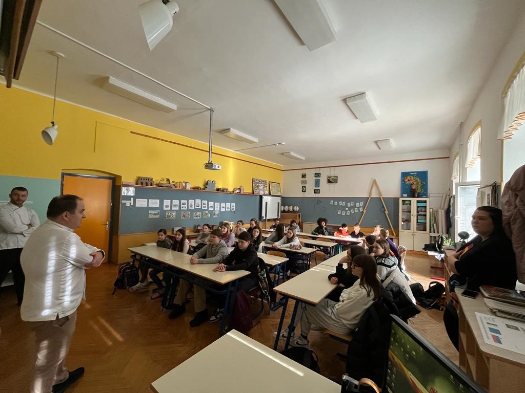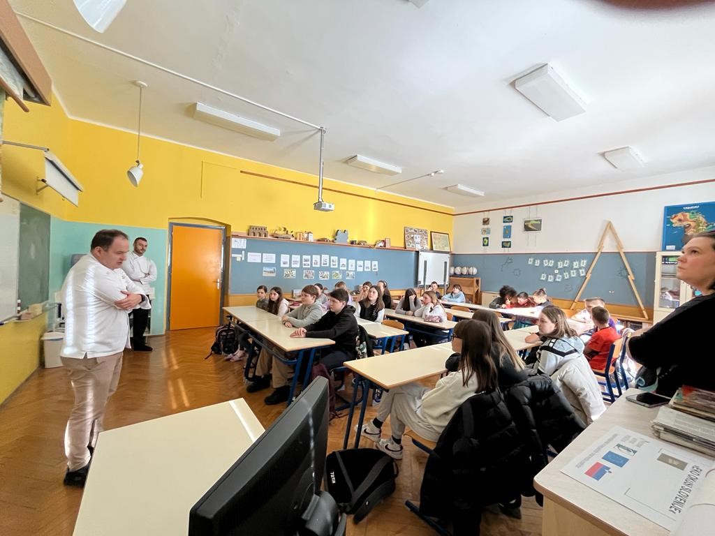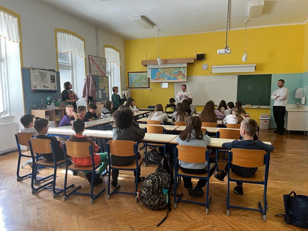 Gospod Jure Tomič je z učenci 6. razreda najprej delil svoje znanje in izkušnje v povezavi z ekološko pridelano hrano ter pomenom ekologije v sodobni kulinariki. Skozi zanimivo predavanje smo spoznavali, kako ekološko pridelane sestavine vplivajo na okus in kakovost jedi, hkrati pa smo se seznanili tudi z načeli trajnostnega kmetovanja ter pomena podpore lokalnim ekološkim pridelovalcem.