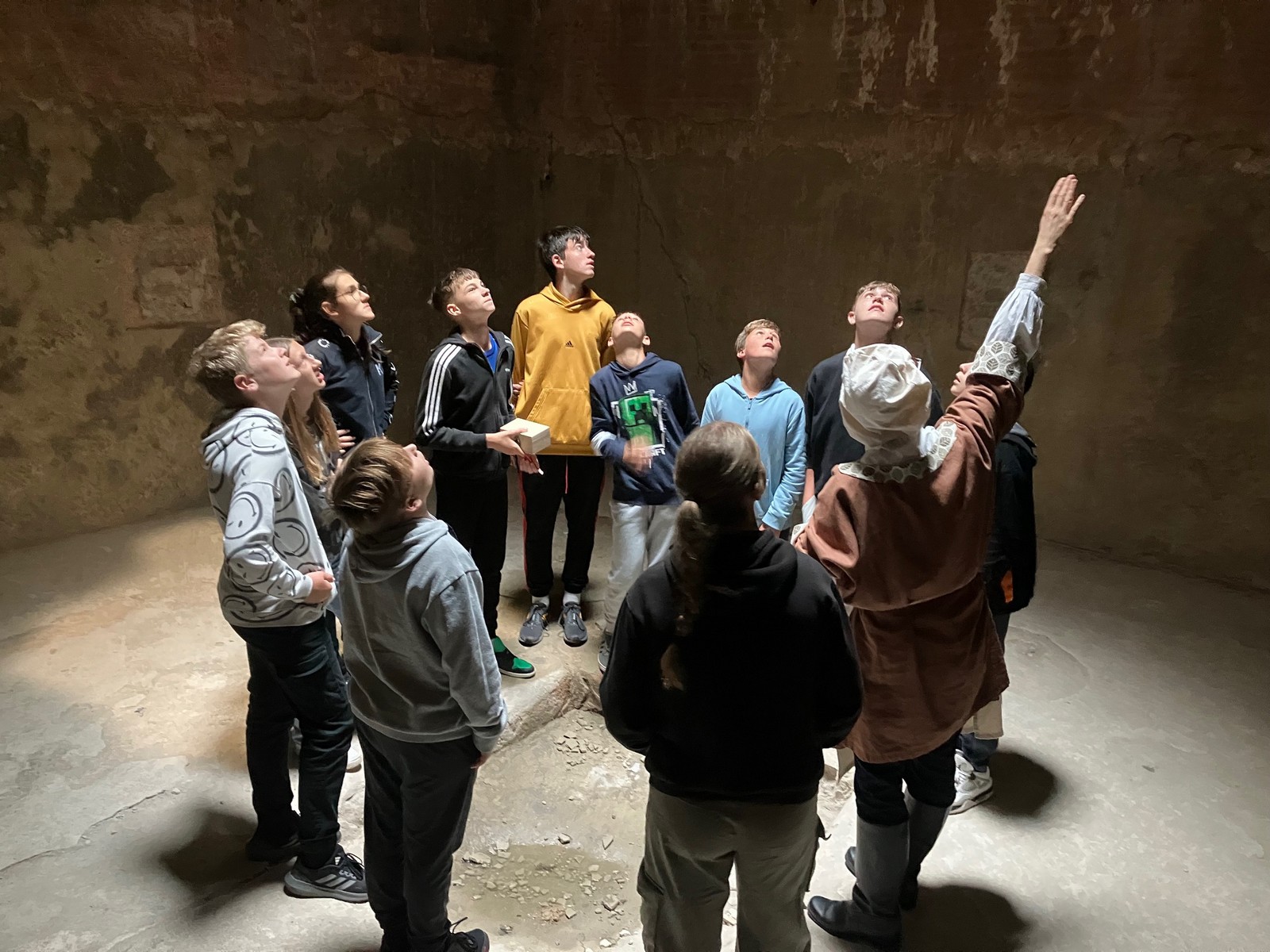 Pot smo začeli z vlakom iz ŽP Brežice, na grad pa smo se povzpeli kar z vzpenjačo. Na vrhu sta nas pričakala vodiča in nas popeljala v srednji vek in njihovo kulinarično doživetje. Na začetku smo si po navodilih pripravili prigrizek – jabolčni zavitek, nato pa smo se podali na lov za zakladom – s pomočjo namigov smo obiskali različne prostore in reševali naloge. Nato smo se vrnili na izhodišče, si pripravili mizo in pripravljeni zavitek tudi pojedli, zraven pa si privoščili še najljubšo pijačo grajskega gospoda – jabolčni sok.