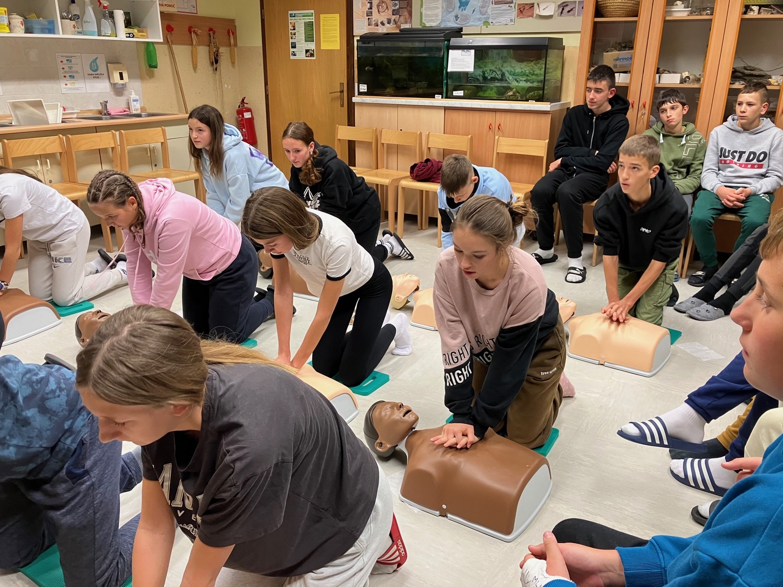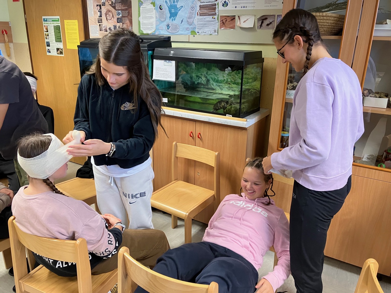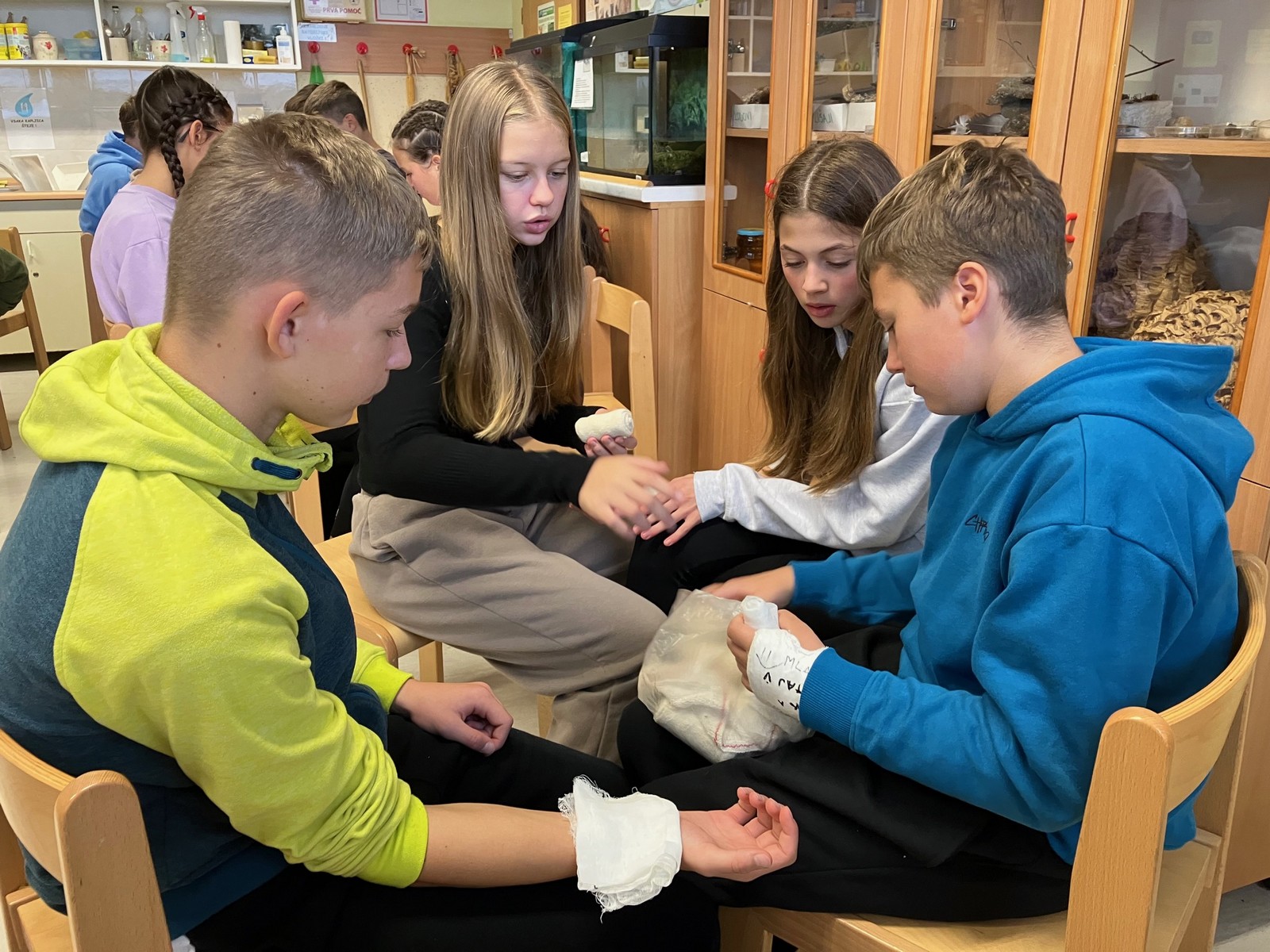 Dopoldanski del je bil namenjen spoznavanju pikov, ugrizov, oskrbovanju ran, transportu ponesrečencev. Popoldan smo se odpravili ven na orientacijski pohod. Gibali smo se po slovensko - avstrijski meji ... z eno nogo smo bili v Sloveniji, z drugo v Avstriji. Polja in travniki, ki smo jih videli pod sabo, so že v Avstriji.