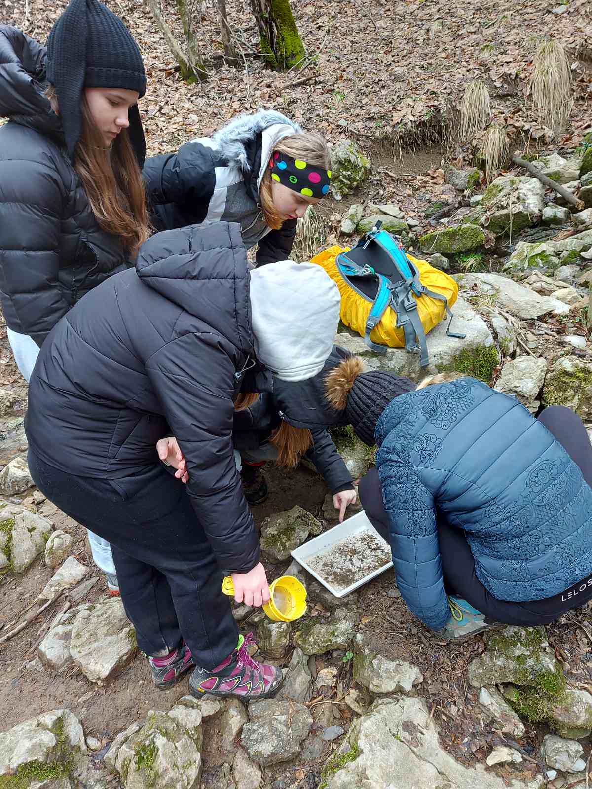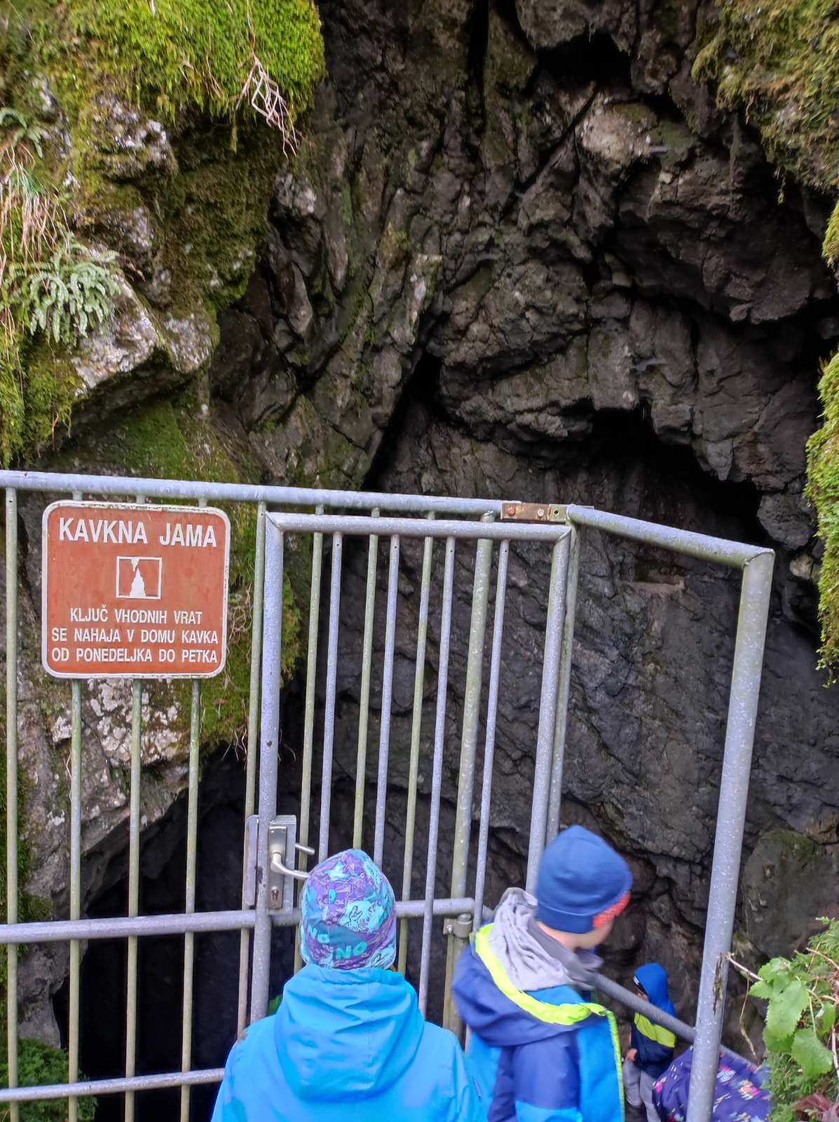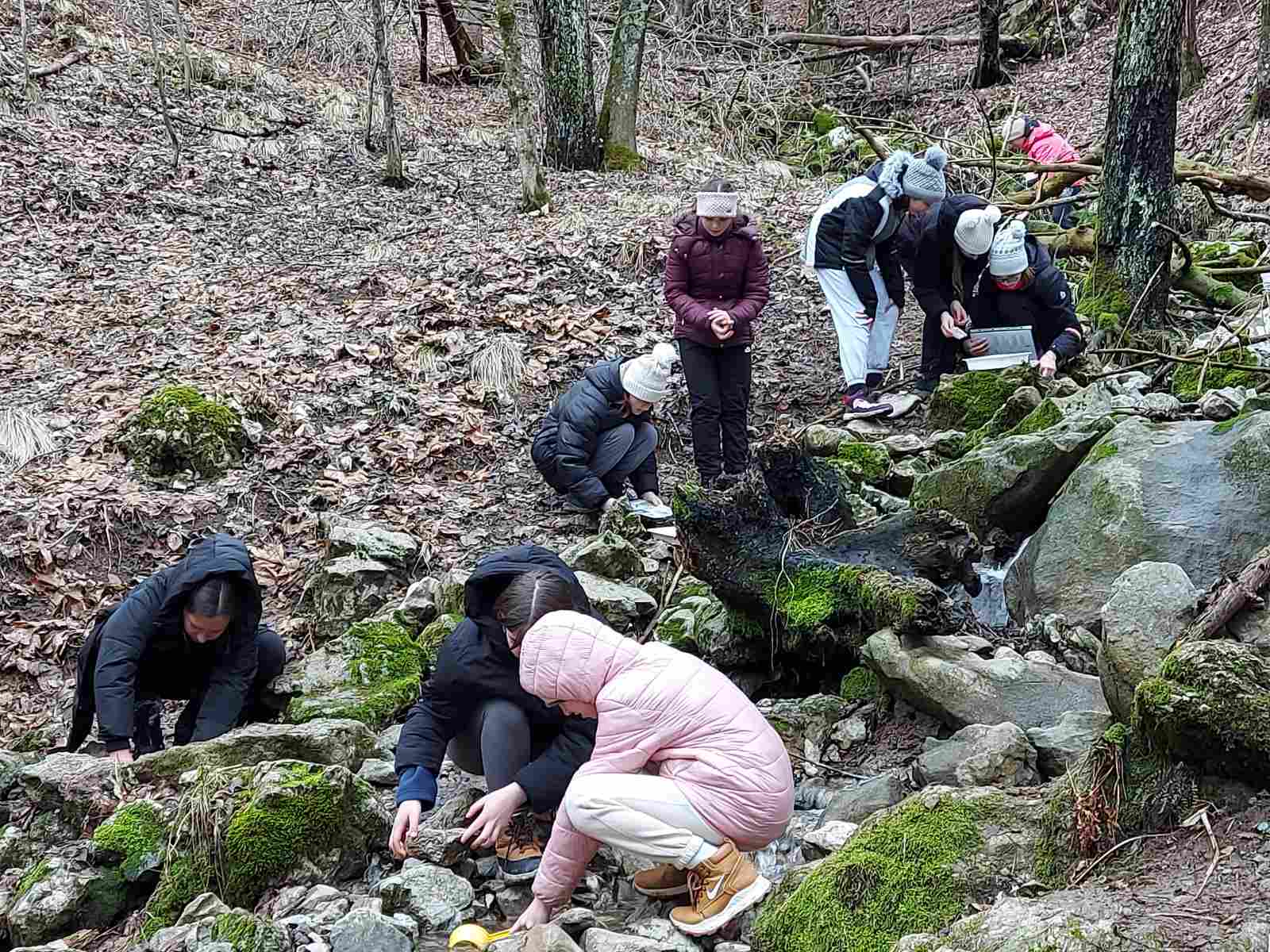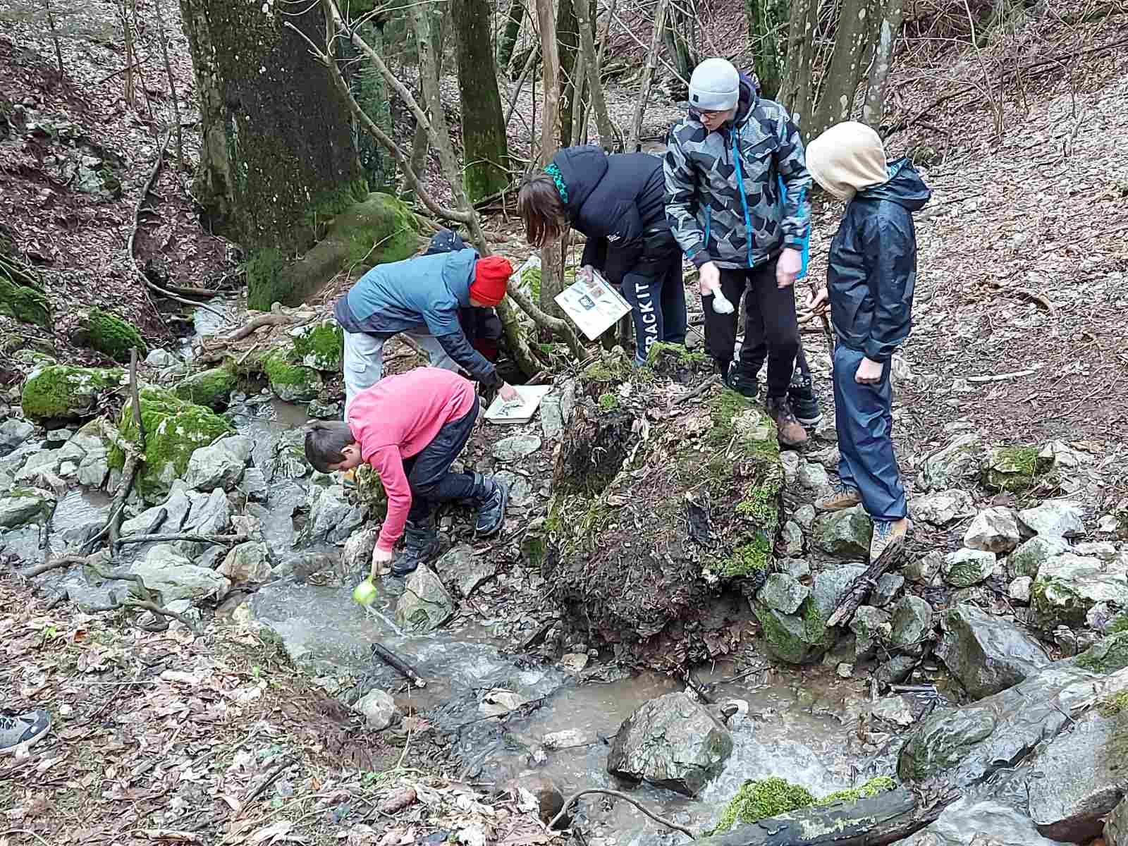 Dopoldne smo obiskali bližnjo Kavkno jamo, približno 100 m dolgo kraško jamo in pri potoku raziskovali vodne organizme.