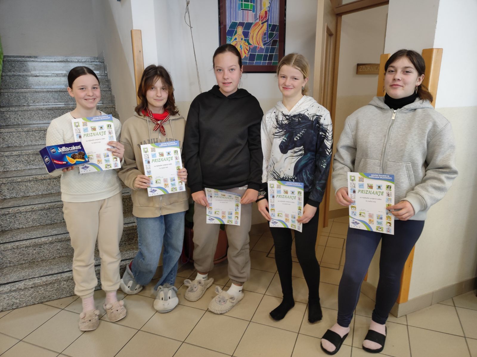 Že pred zajtrkom smo imeli vse stvari v kovčkih. Učenci so ves teden skrbeli za čistost in urejenost sob, ocene pa so prejeli še za nočni mir. Najbolj so se izkazala dekleta, ki so bivala v gnezdu šoj: Valentina, Nika T., Zala, Leyla in Neža.