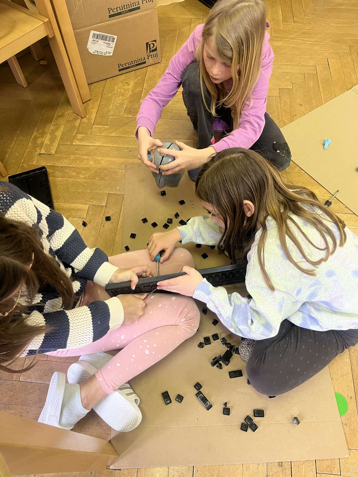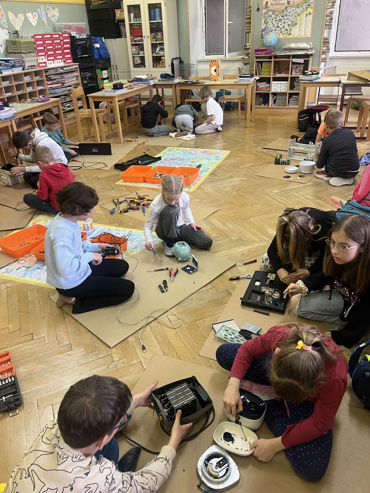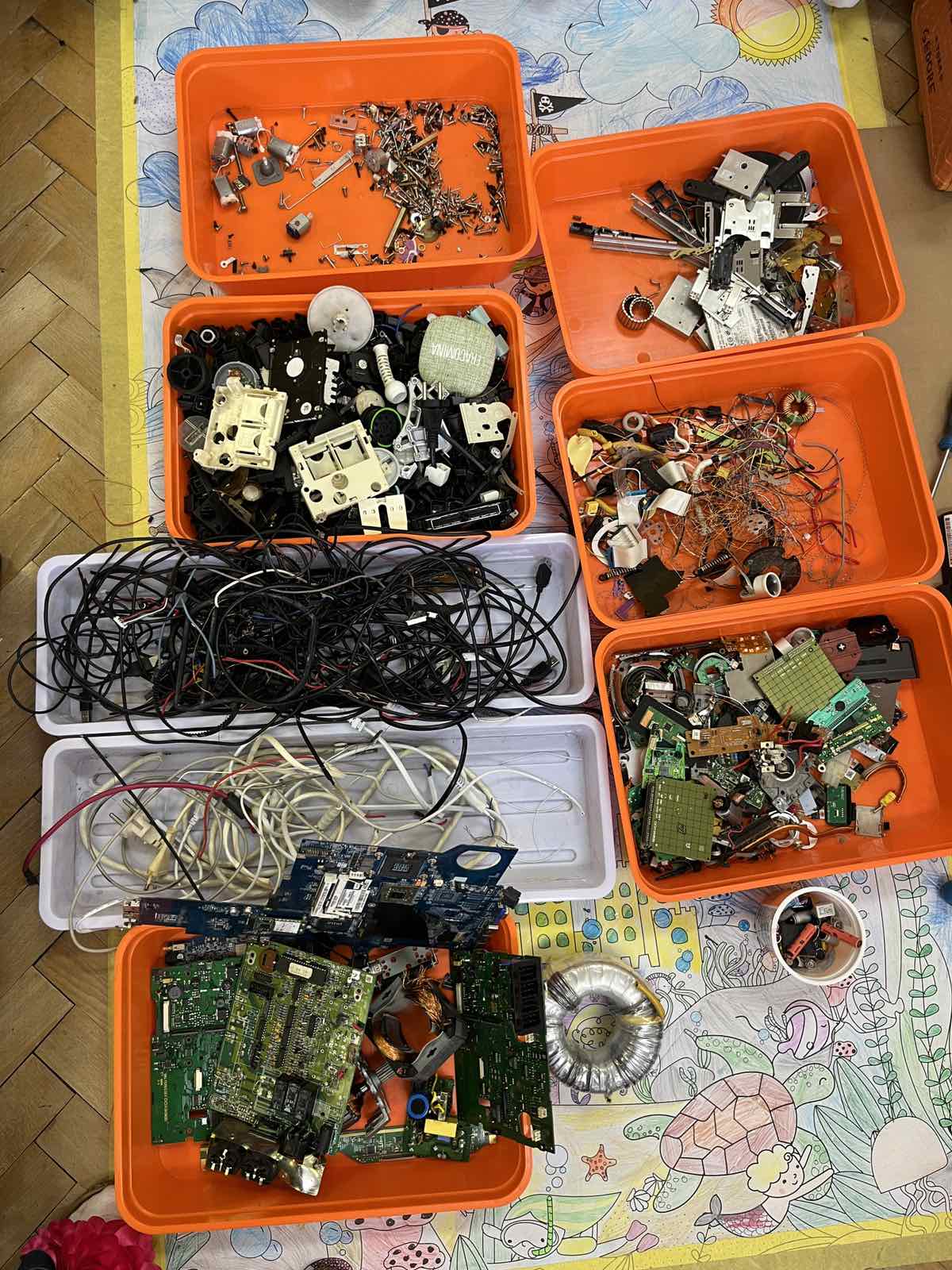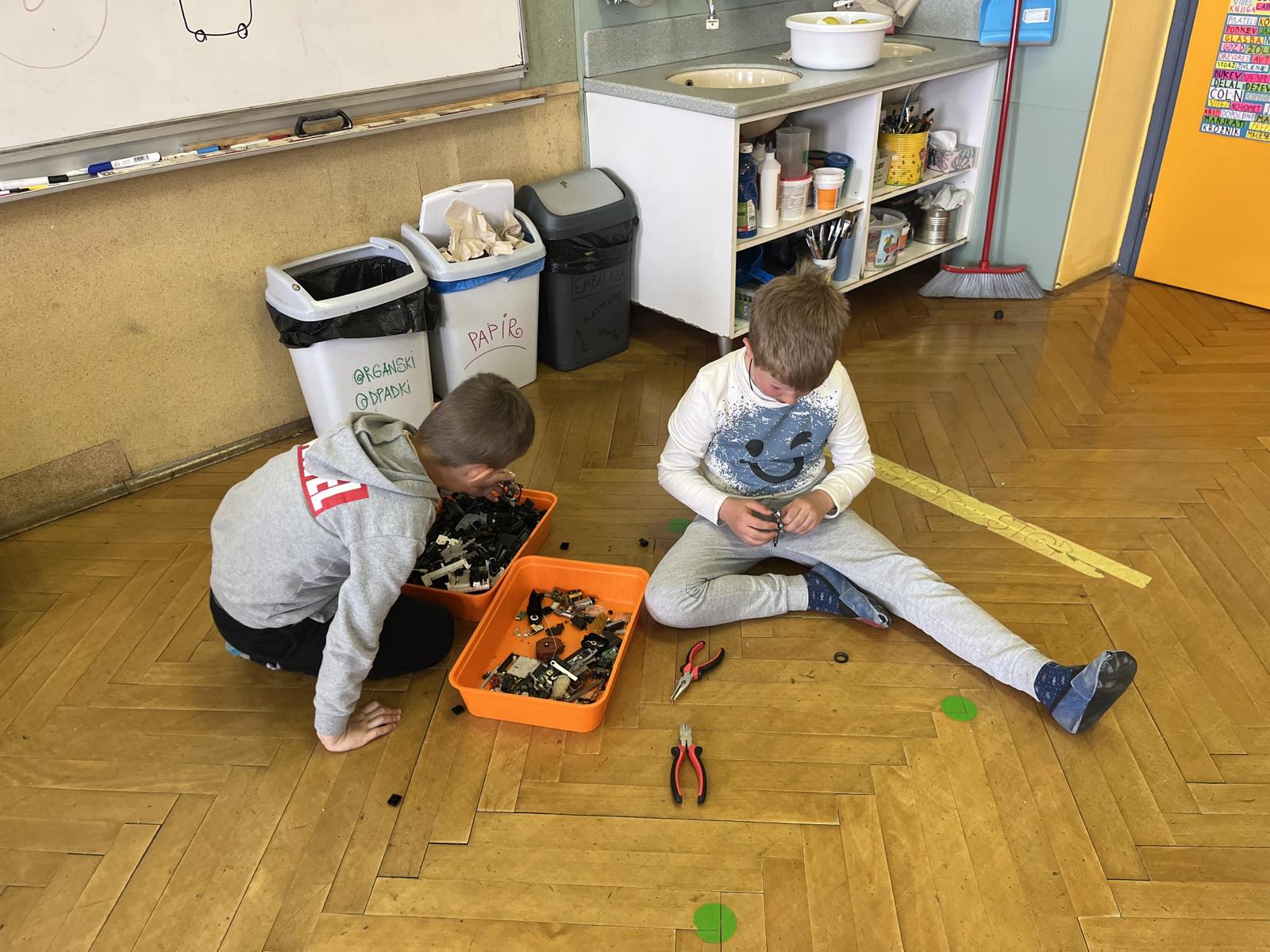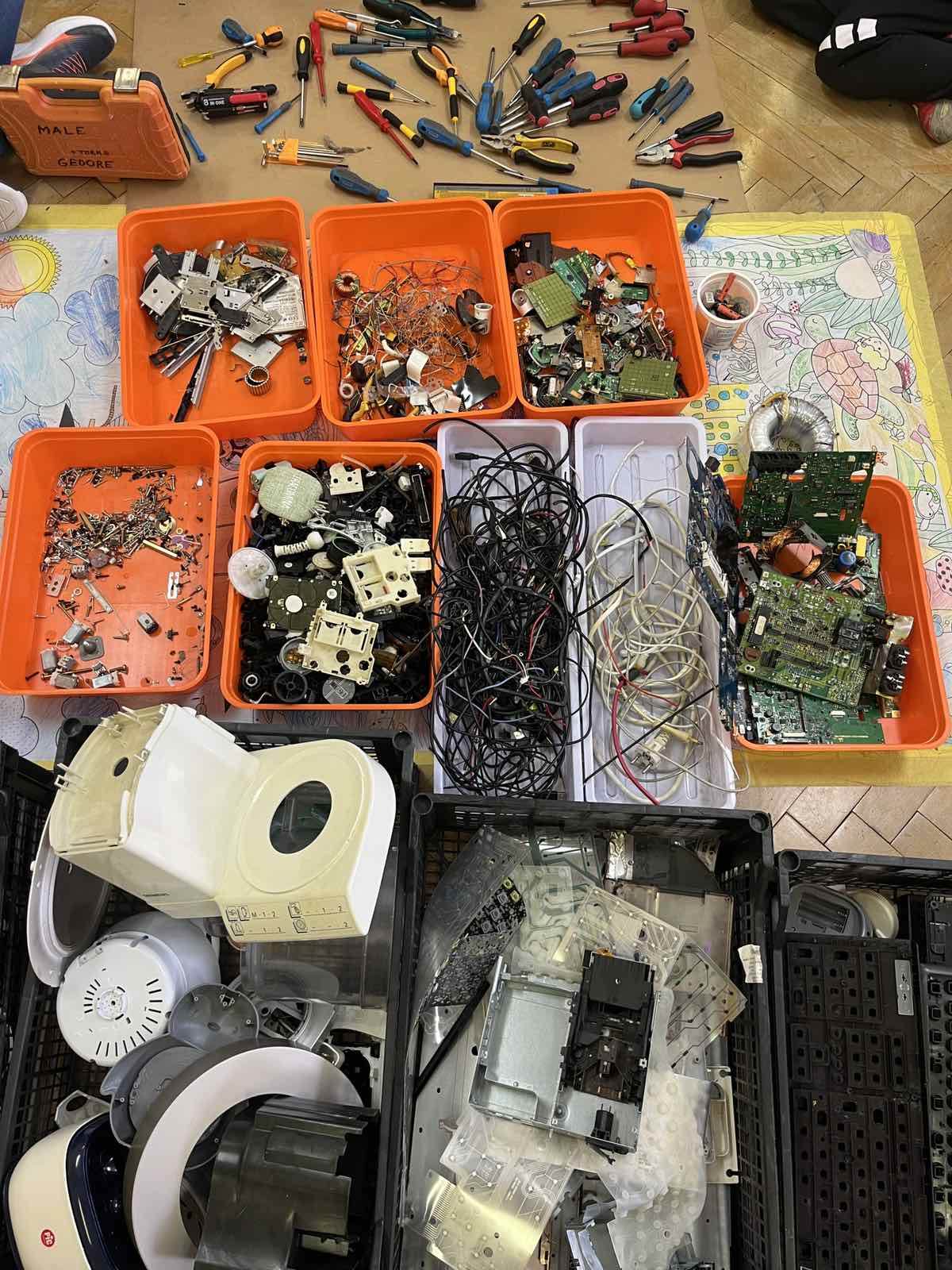Na tehniškem dnevu smo razstavili vse naprave in njihove delčke sortirali po podobnosti: vijaki skupaj, žice skupaj, majhni plastični delčki skupaj, ohišja...
