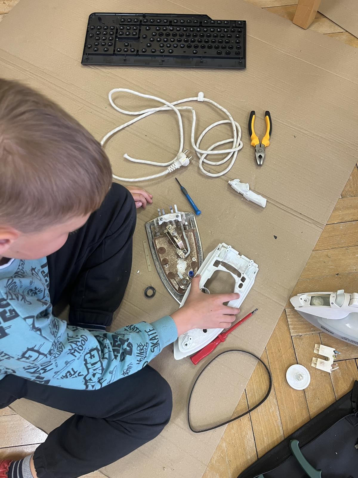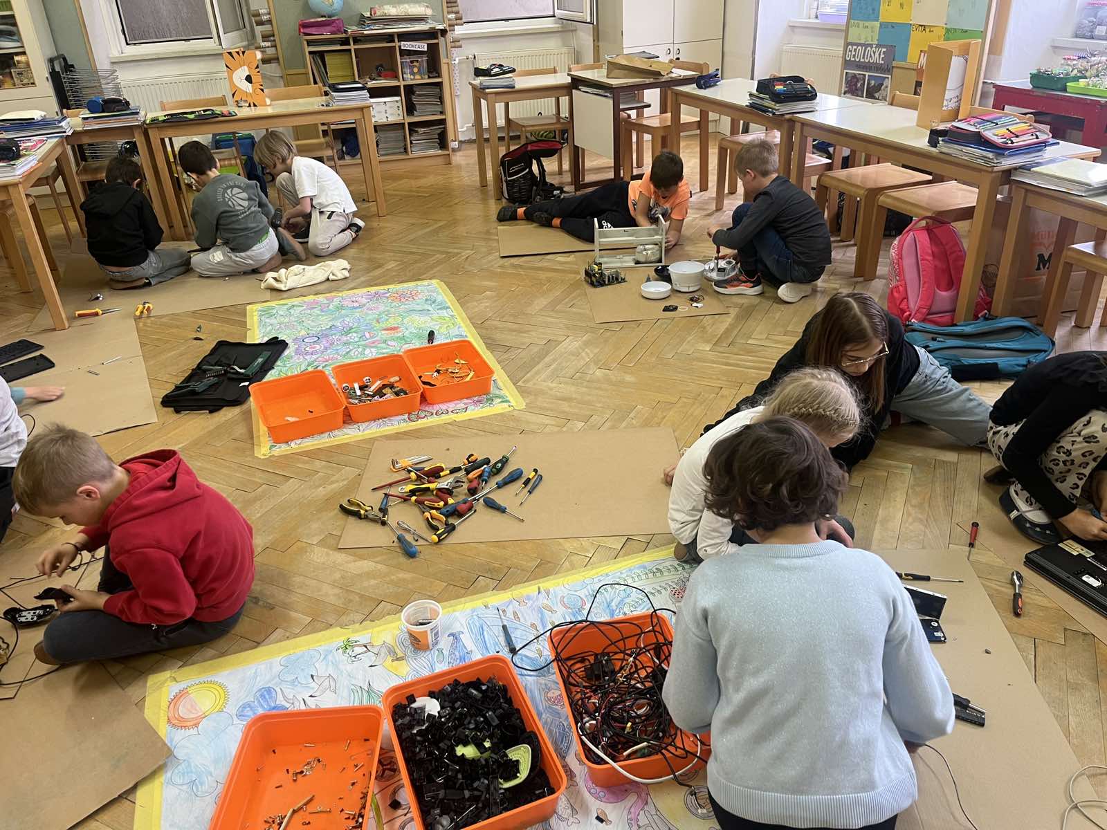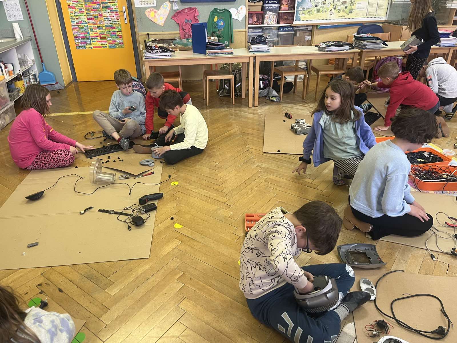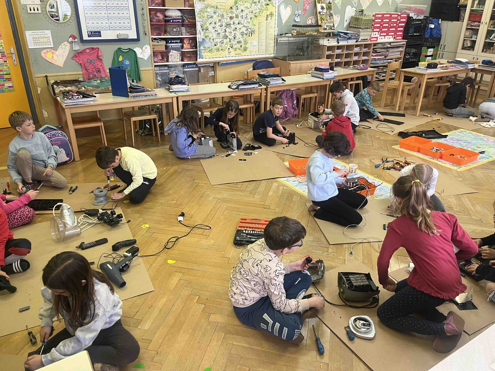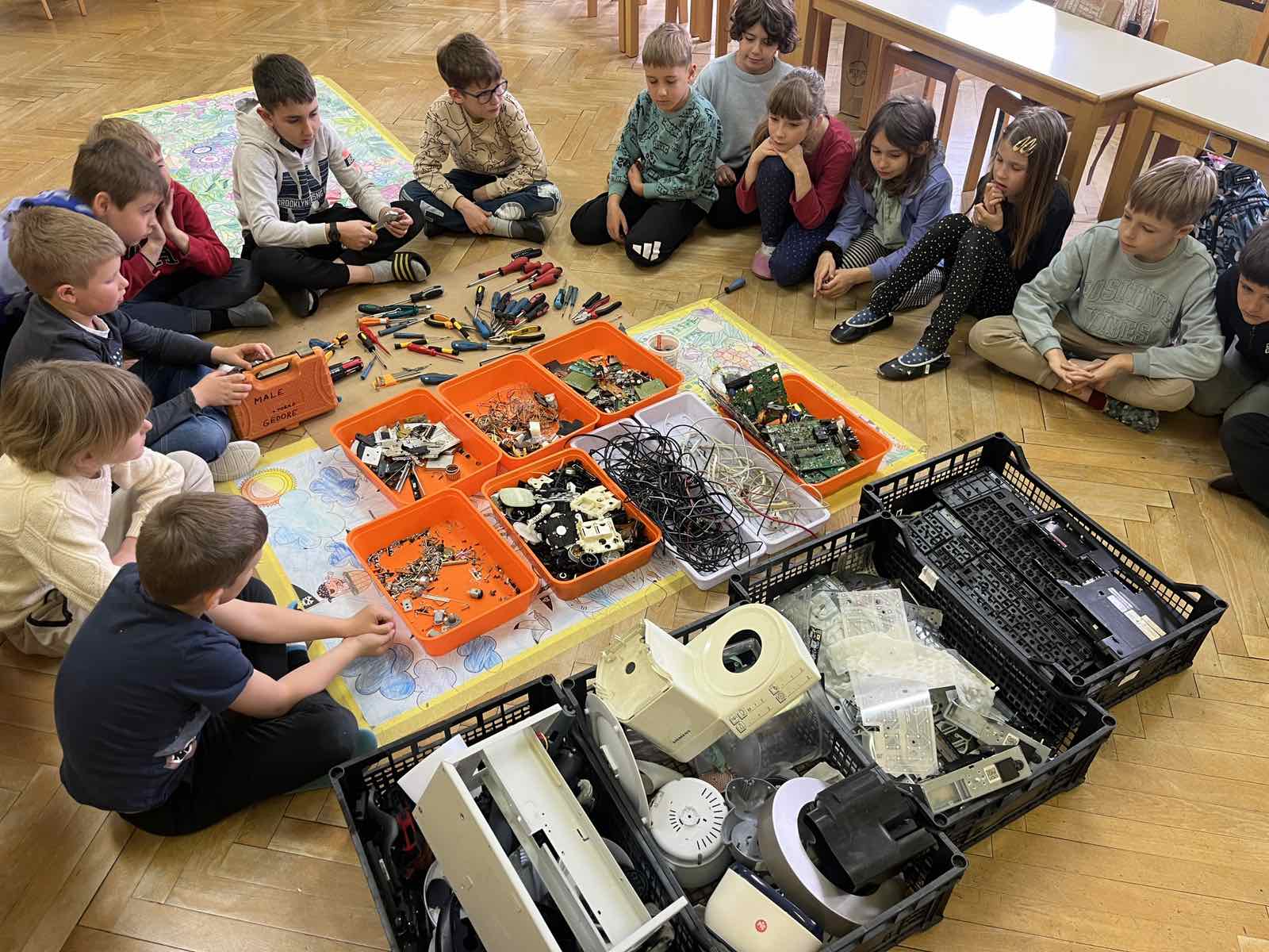 Na tehniškem dnevu smo razstavili vse naprave in njihove delčke sortirali po podobnosti: vijaki skupaj, žice skupaj, majhni plastični delčki skupaj, ohišja...