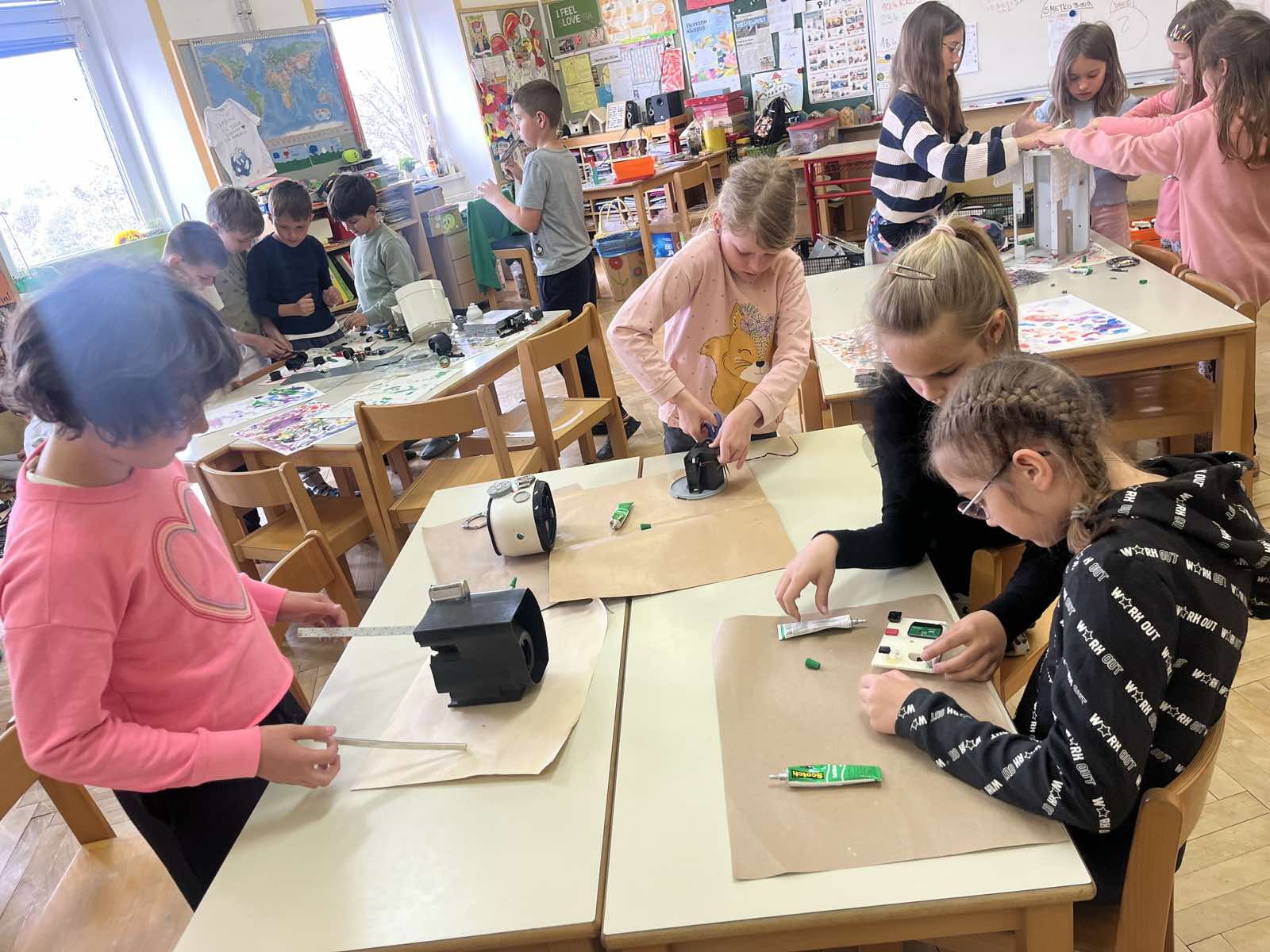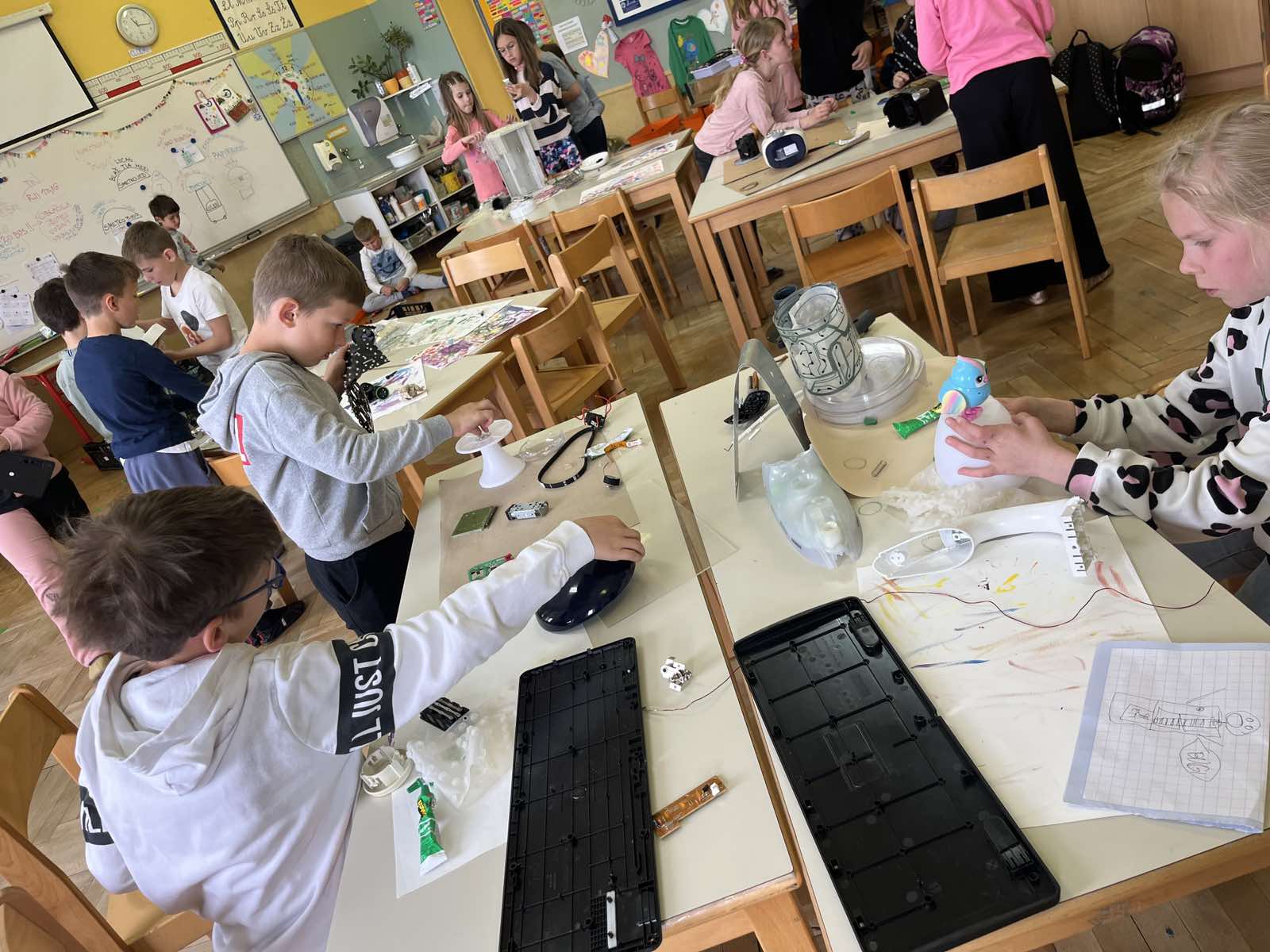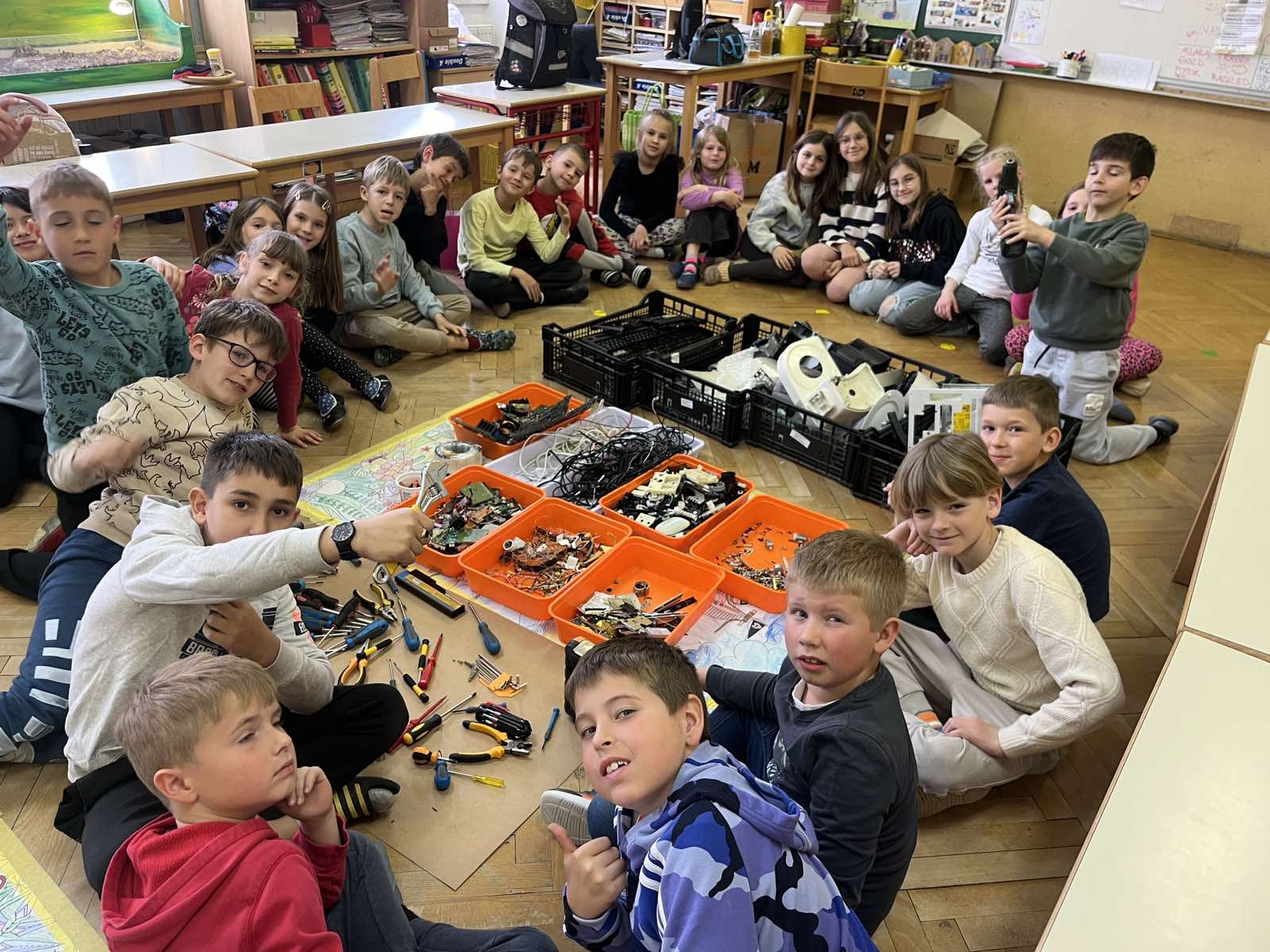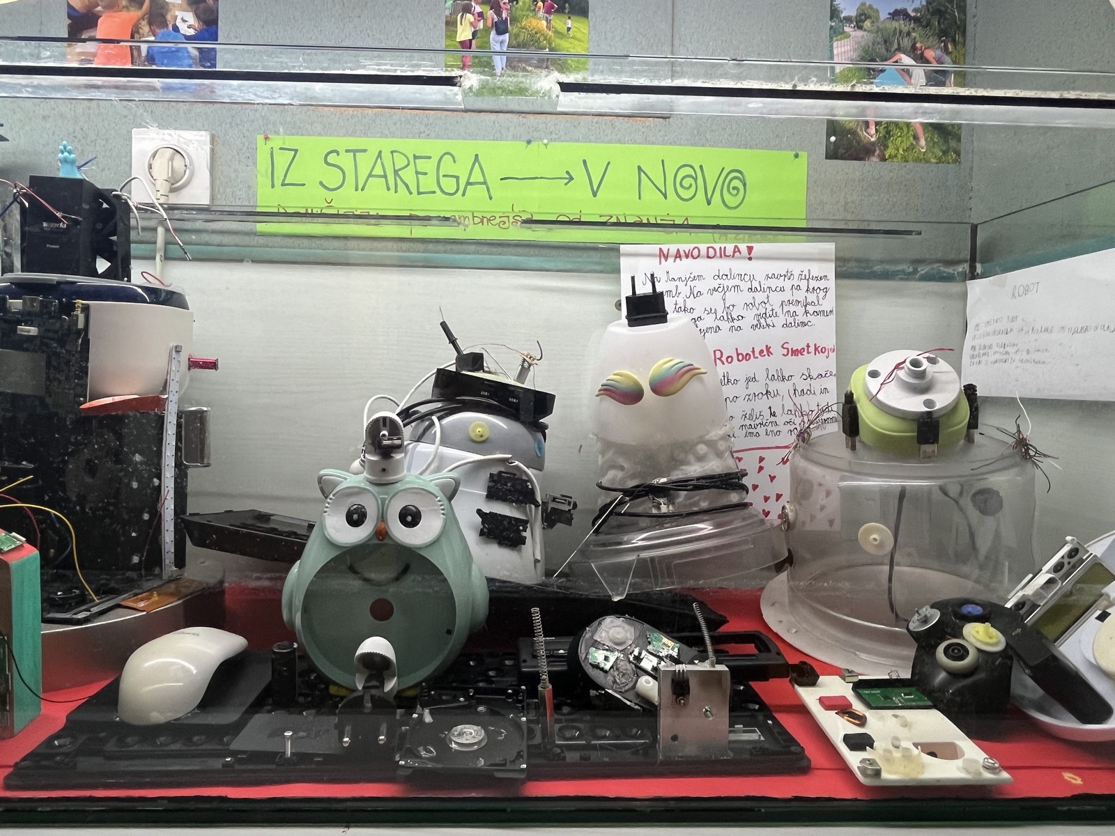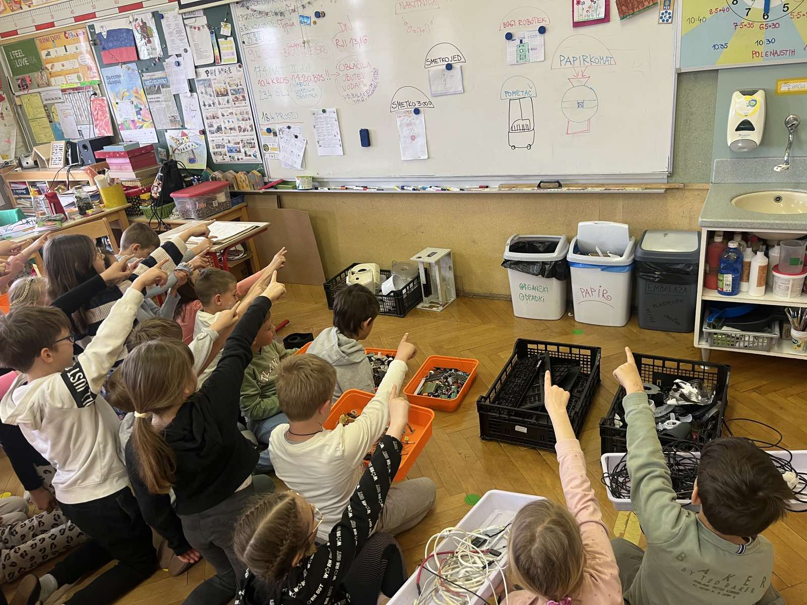 Tretješolci smo izključno iz odpadnih naprav, ki smo jih zbirali dva meseca, izdelali 8 inovativnih robotkov z novimi idejnimi sporočili.