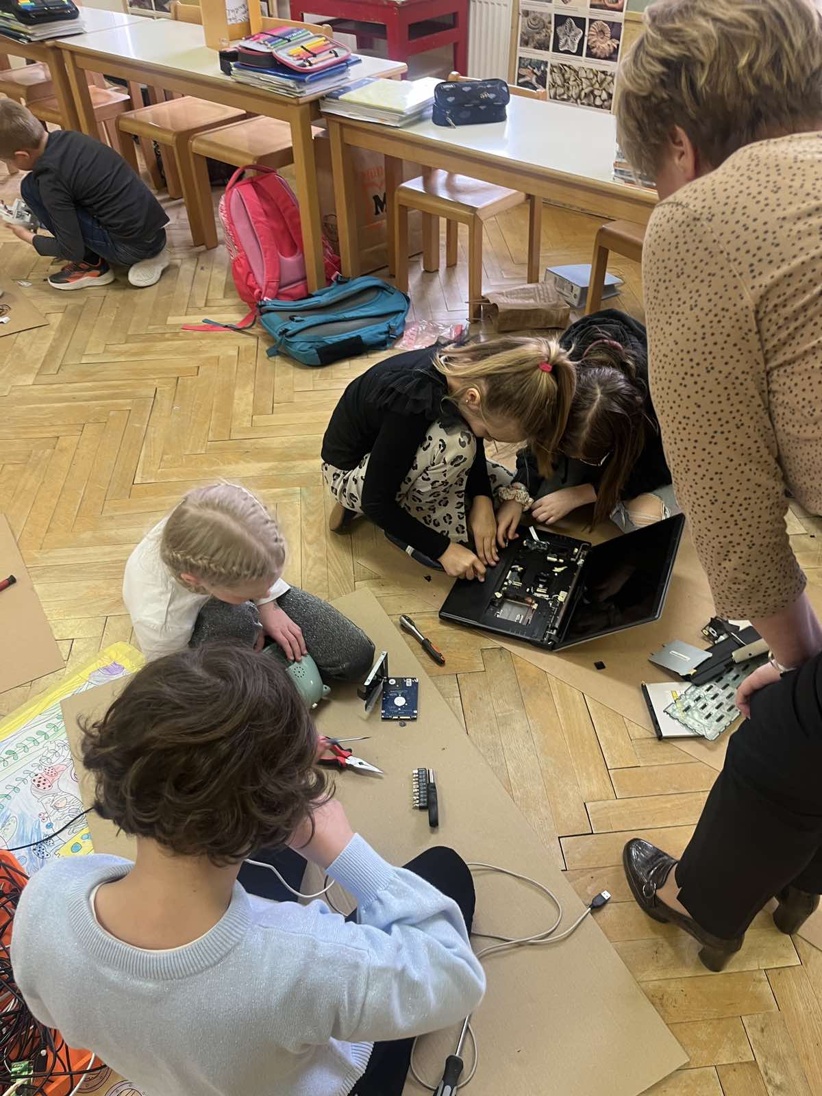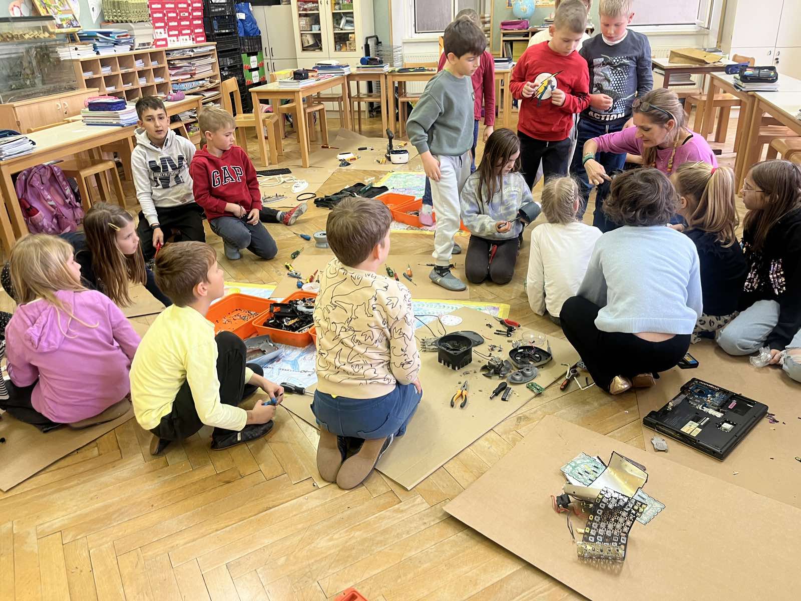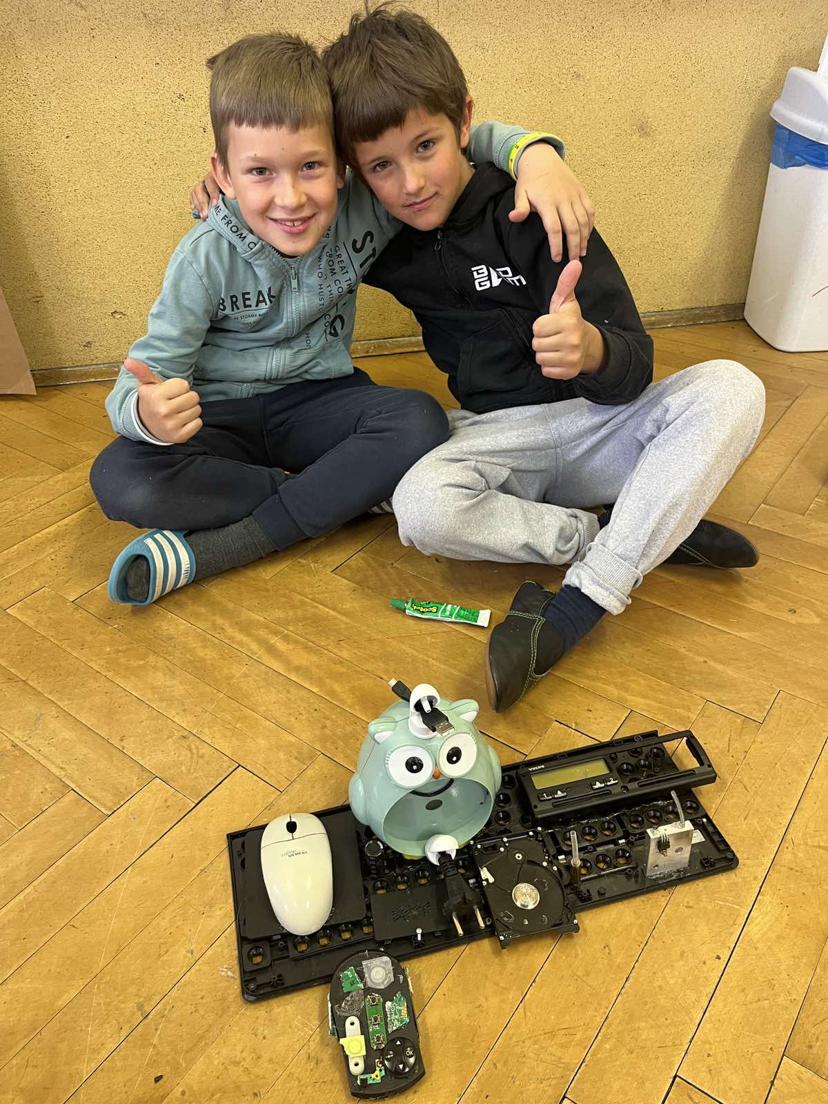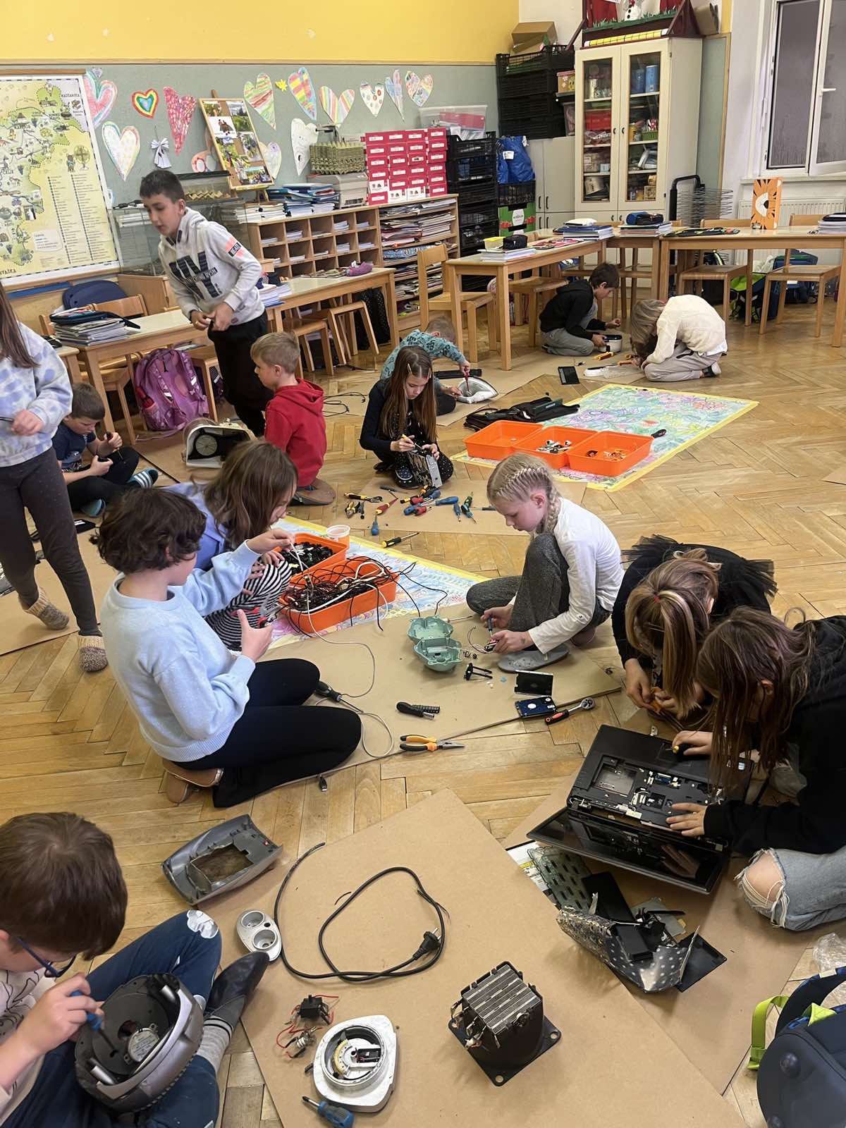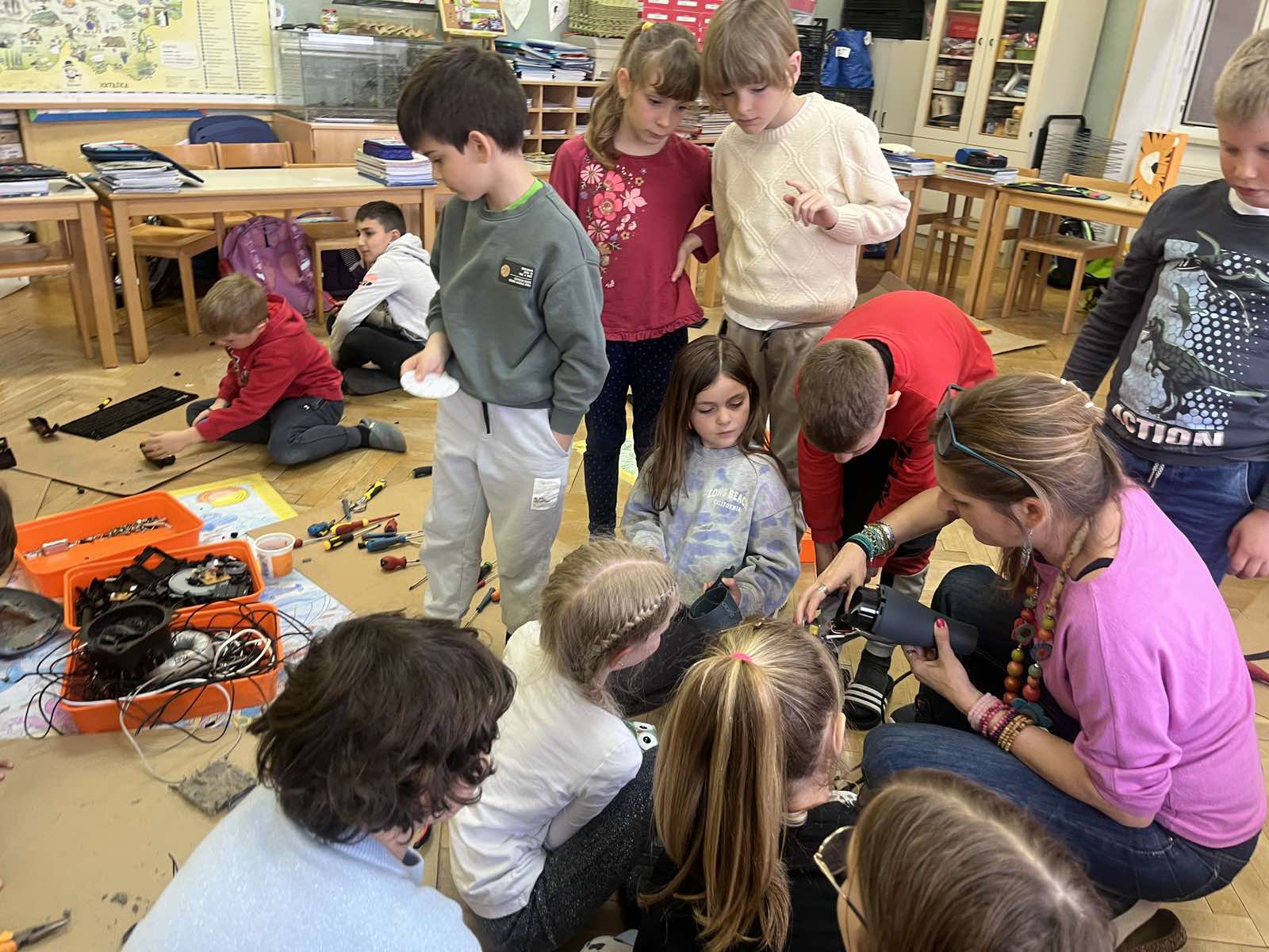 Tretješolci smo izključno iz odpadnih naprav, ki smo jih zbirali dva meseca, izdelali 8 inovativnih robotkov z novimi idejnimi sporočili.