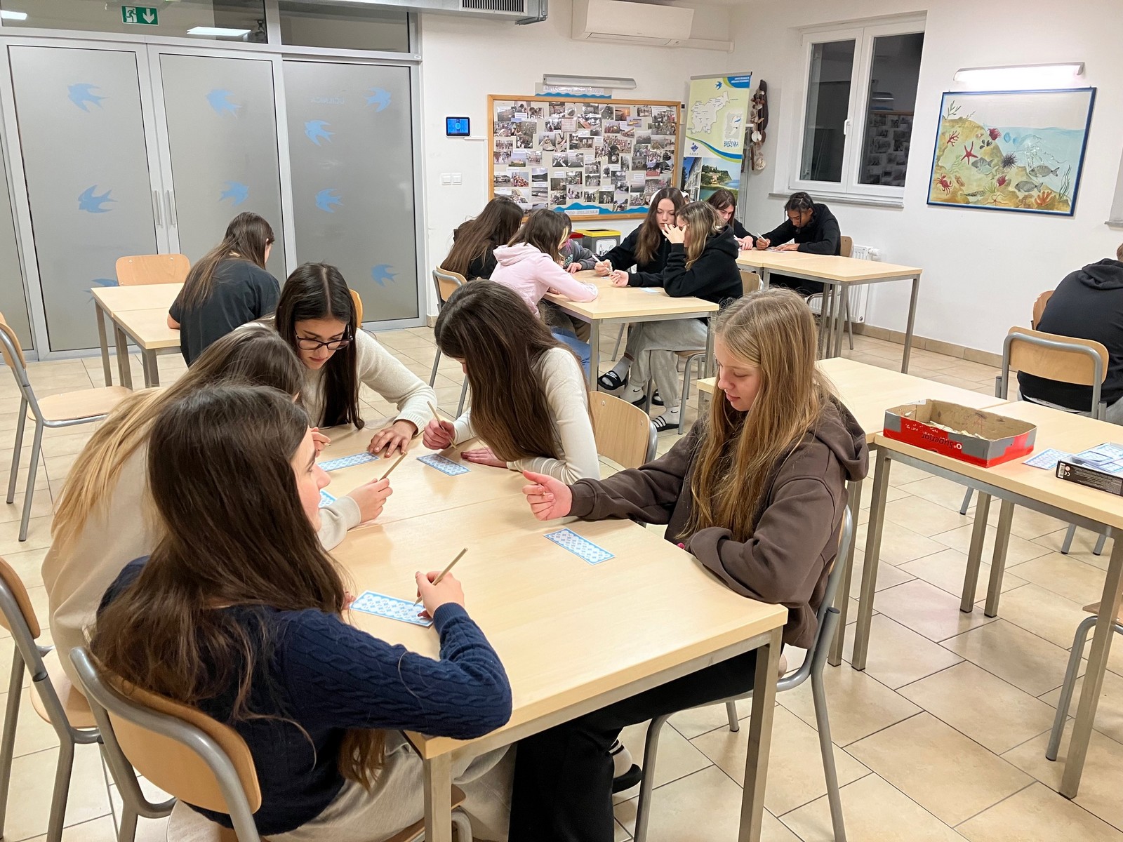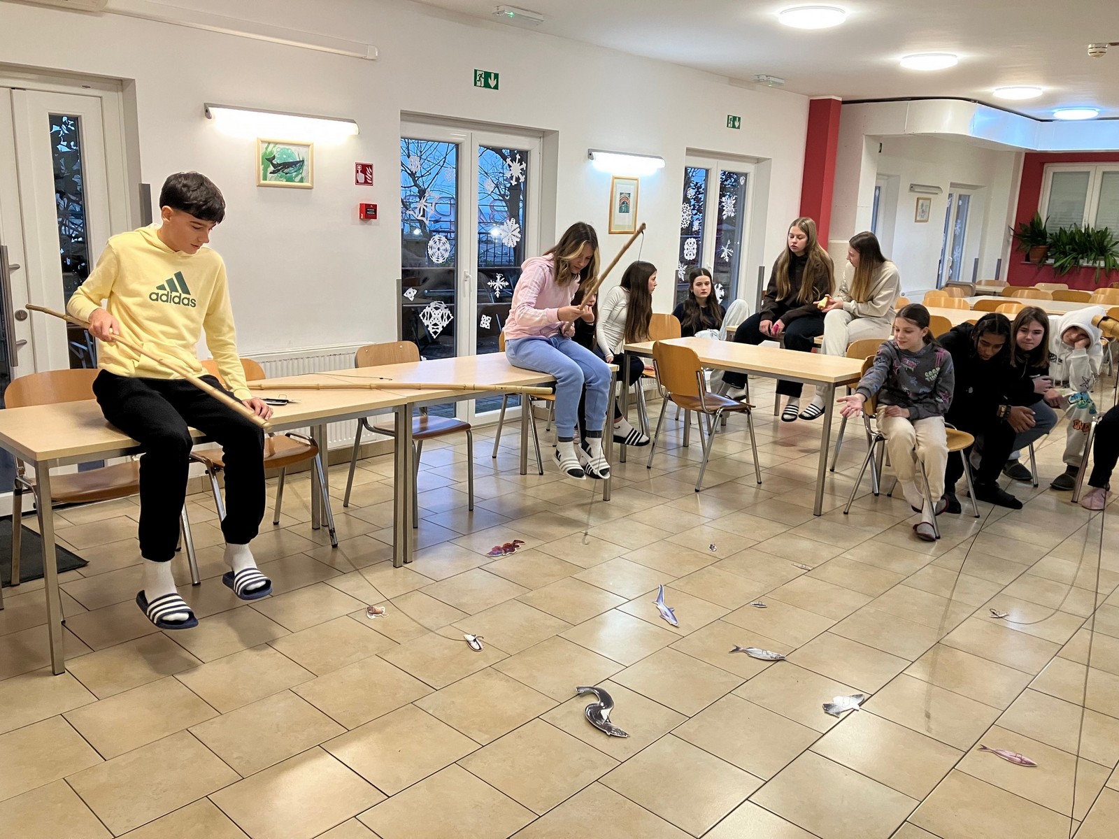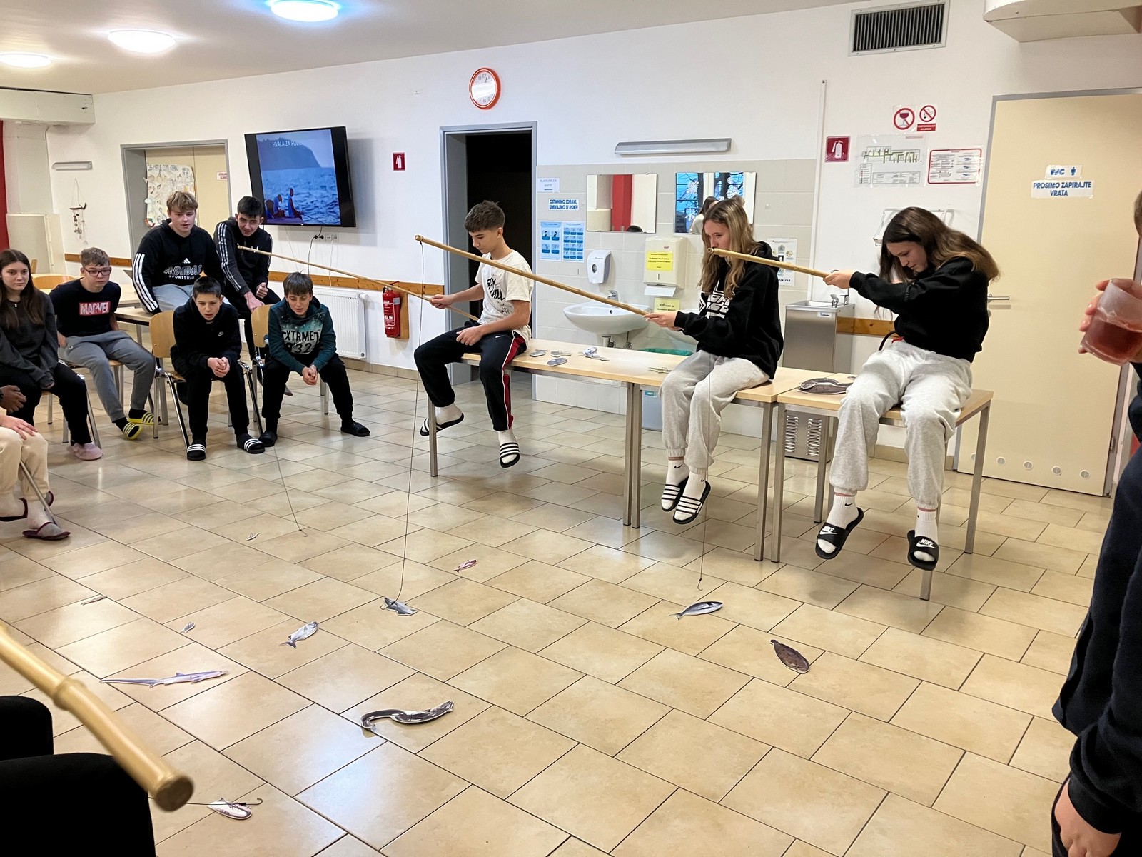 Med usmerjenim prostim časom smo igrali družabne in športne igre ali pa malce počivali po sobah, popoldne pa so sledile popoldanske aktivnosti - spoznavali so pomen ribištva, lovili papirnate ribe - žal vremenski pogoji niso dopuščali, da bi lovili v morju - in se sprehodili okrog jezera v Fiesi ter spoznavali živo in neživo naravo.