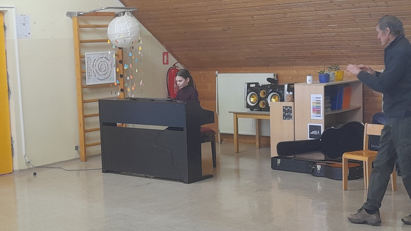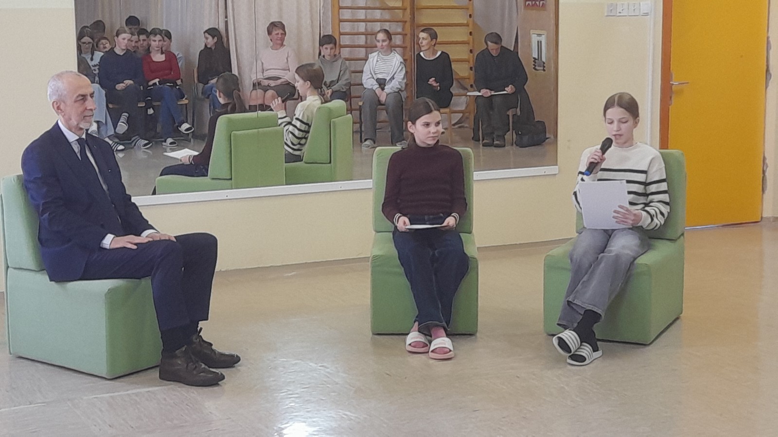 O svojem ustvarjanju se je pogovarjal z učenci od 6. do 9. razreda, pogovor z njim pa sta vodili učenki Kaja Binter in Ina Furar.