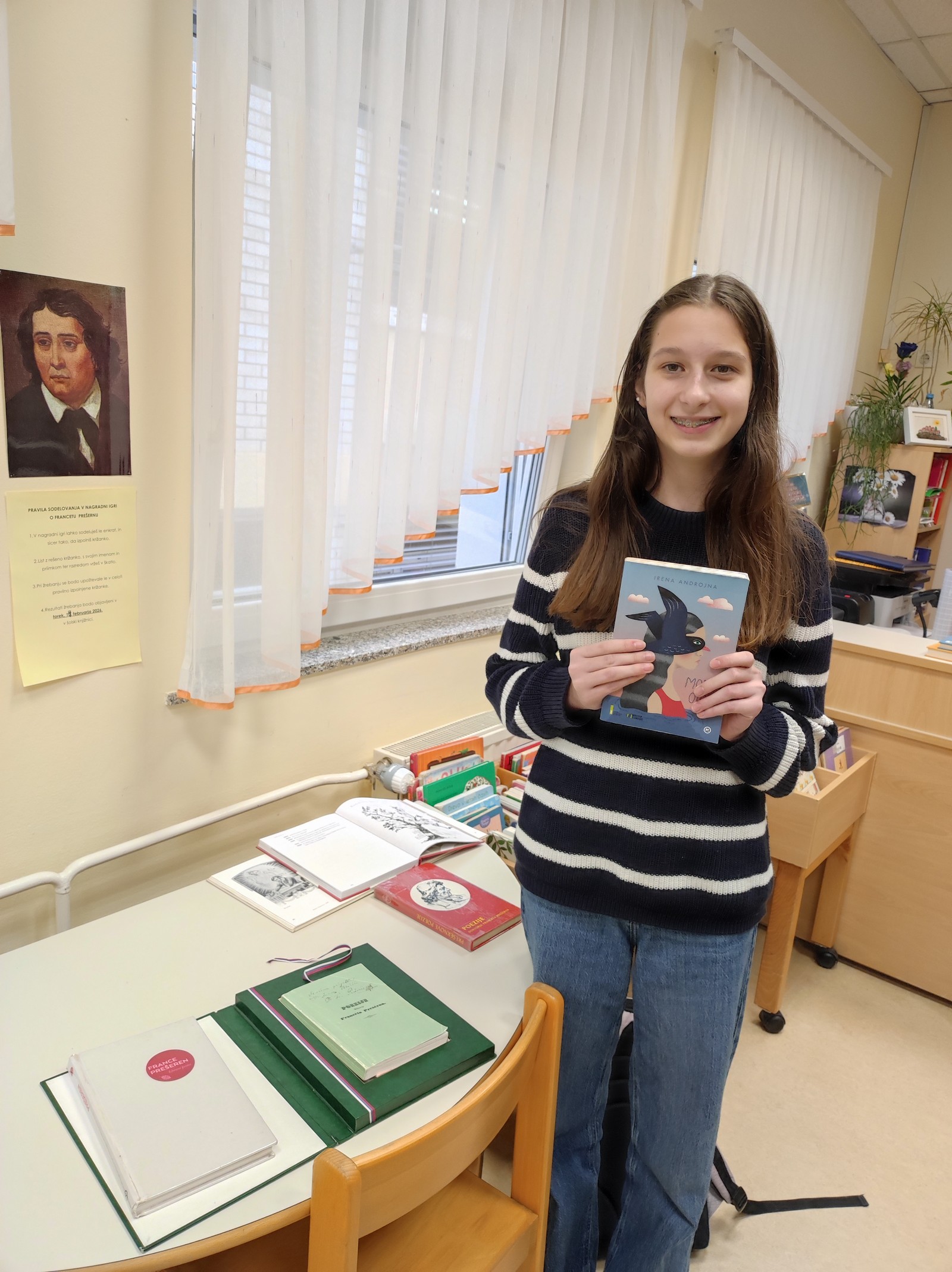 Srečna nagrajenka s popolnoma pravilno rešitvijo je Julija Gerjevič iz 8. a razreda, ki je za nagrado prejela knjigo Irene Androjna Modri otok.
