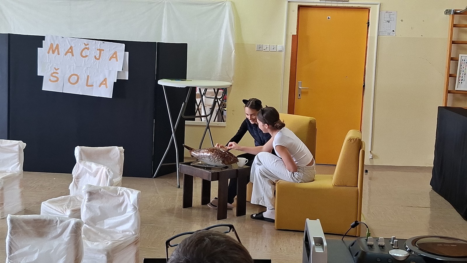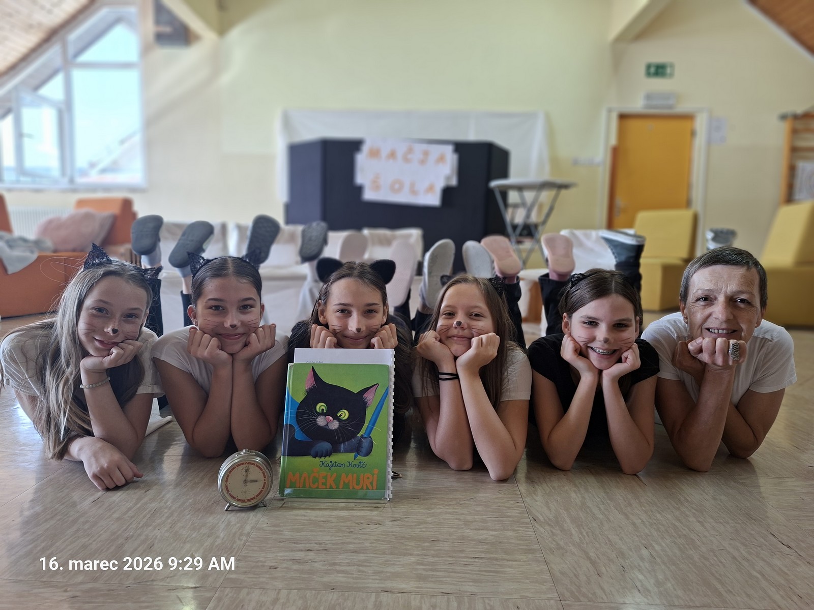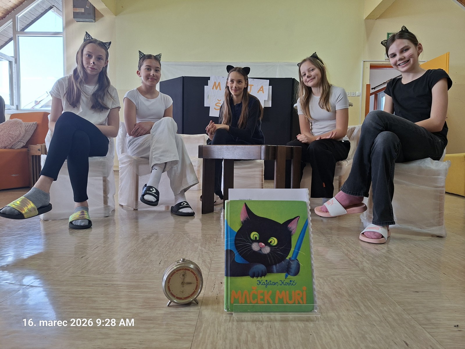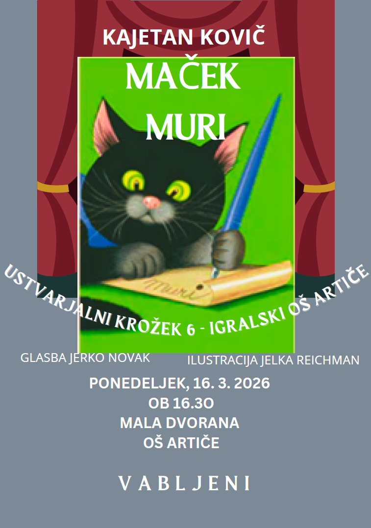 V ponedeljek, 16. 3. 2026, so učenke Igralskega kluba 5-6 odigrale predstavo Maček Muri, ki je nastala po pravljici Kajetana Koviča in ob glasbi Jerka Novaka.