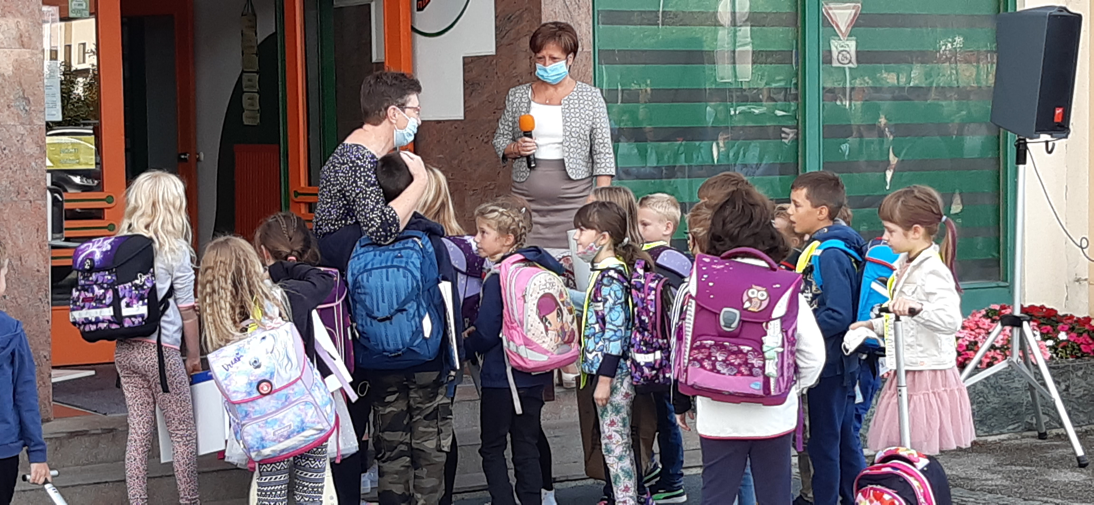 Tako smo se lahko vsi skupaj srečali pred šolo, kjer nas je pozdravila ga. ravnateljica Vesna Bogovič.