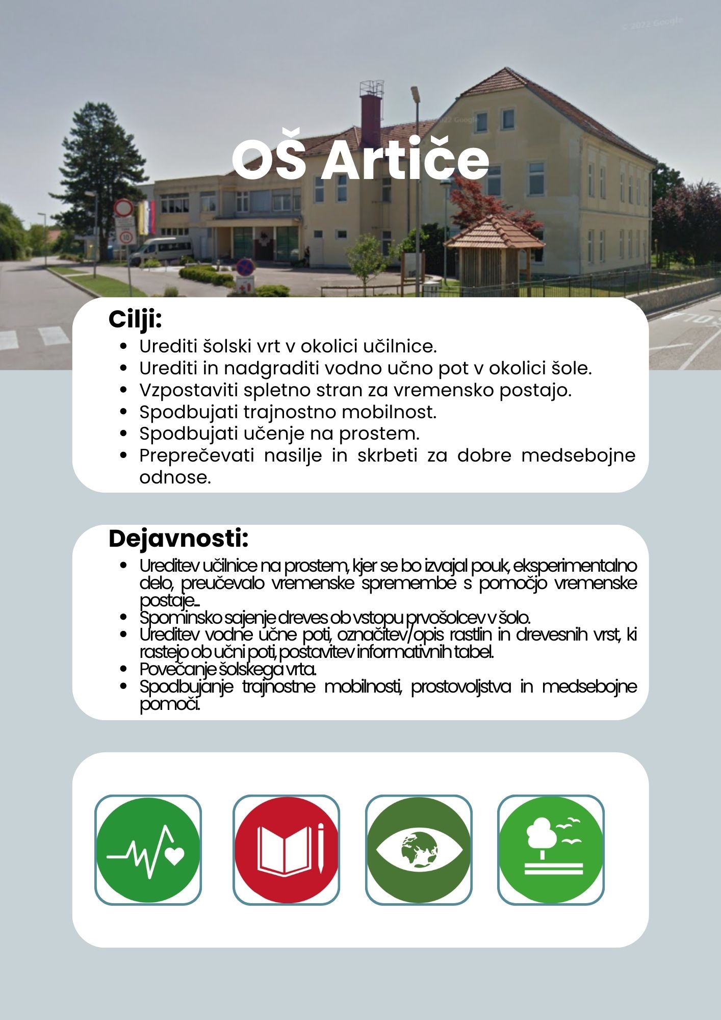 V okviru izvajanja ukrepa sta predvidena preizkus in evalvacija programa na širšem vzorcu do 80 šol oziroma vzgojno-izobraževalnih organizacij. Predvidoma bo vzpostavljenih skupno do 15 demonstracijskih vzgojno-izobraževalnih zavodov oziroma organizacij. Poleg navedenega bo v okviru ukrepa zagotovljena finančna podpora za do 40 odstotkov vzgojno-izobraževalnih zavodov oziroma organizacij za izvajanje krajših dejavnosti, povezanih s podnebnimi cilji, ki so v Sloveniji že uveljavljene ter jih bodo strokovno verificirali zgoraj navedeni javni zavodi, vsak za svojo raven oziroma področje dela.